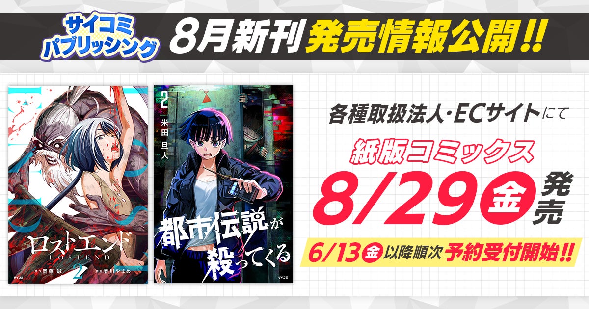 「サイコミ」都市伝説バトルマンガ『都市伝説が殺ってくる』・"死に戻り"ダークサバイバル『ロストエンド』の最新刊が6月13日(金)に予約開始!