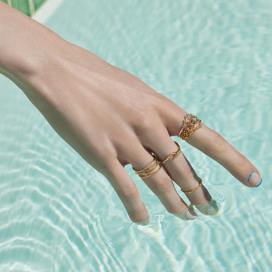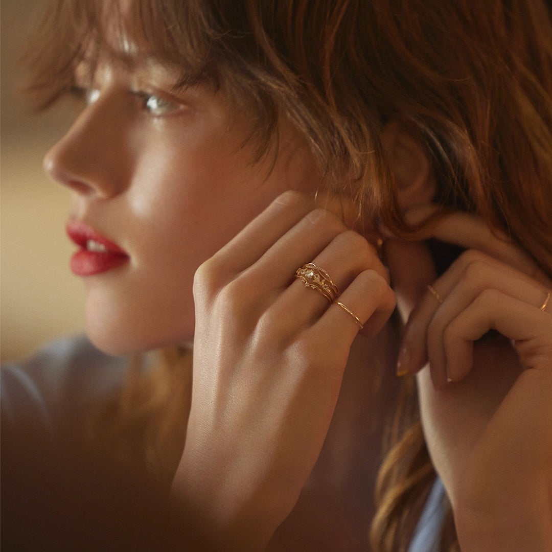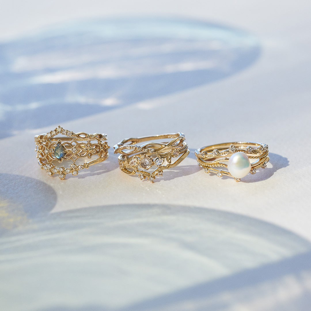 3本がぴったりと重なるようにデザインされたレイヤードリング。シャンデリアをモチーフに、贅沢な石使いと繊細な地金装飾で表現しました。