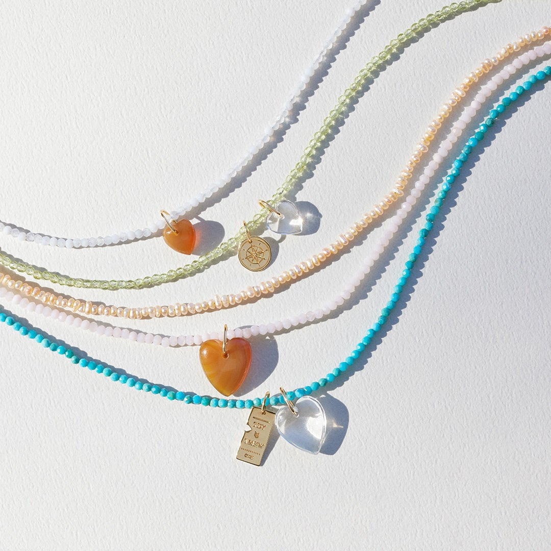 カラーストーンのネックレスにバスチケットやコンパスにハートモチーフを組み合わせて、旅する時のわくわくする気持ちを表現したプレイフルなジュエリーがラインナップ。