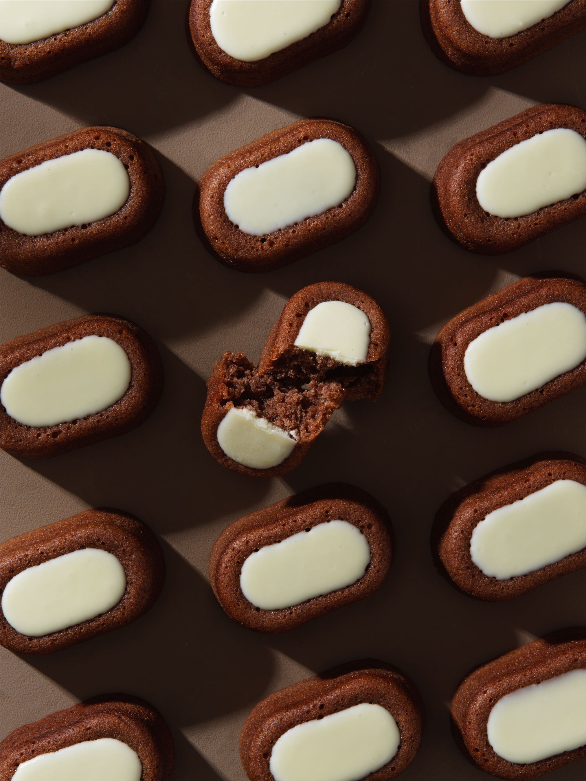生地には、コク深くミルキーなカマンベールチーズと濃厚なチェダーチーズの2種を、力強いガーナ産ダークチョコレートとともにブレンド。カカオの風味の中に奥深いチーズ感が加わり、絶妙なバランスを生み出しています。さらに、ココアパウダーとアーモンドプードルを合わせることで、全体のコクを一層深めました。天面には、ゴーダとチェダーを組み合わせたチーズチョコレートを飾り、一口食べた瞬間にマイルドなチーズの風味が全体をまとめあげます。