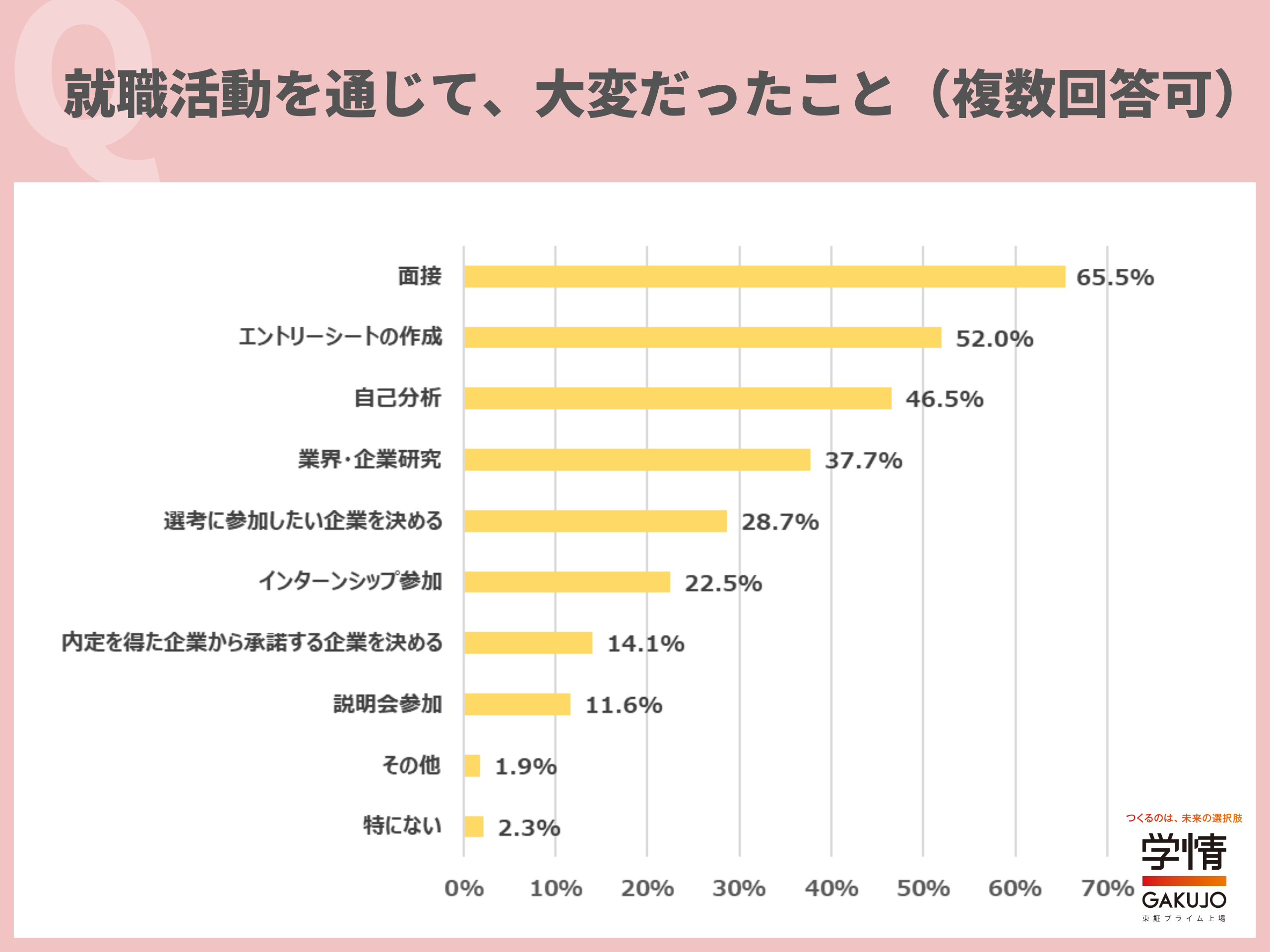 就職活動を通じて大変だったことは「面接」が65.5%で最多。次いで、「エントリーシートの作成」52.0%、「自己分析」46.5%、「業界・企業研究」37.7%が続きました。「自己分析や業界・企業研究は全てのベースになると思う」「自己分析や業界・企業研究は、ここまでやれば良いというゴールがないので大変だった」「面接は時間もお金もかかるので、就職活動以外の予定と調整するのが大変だった」「履歴書やエントリーシートを手書きで提出する企業があり、作成に時間がかかった」などの声が上がりました。