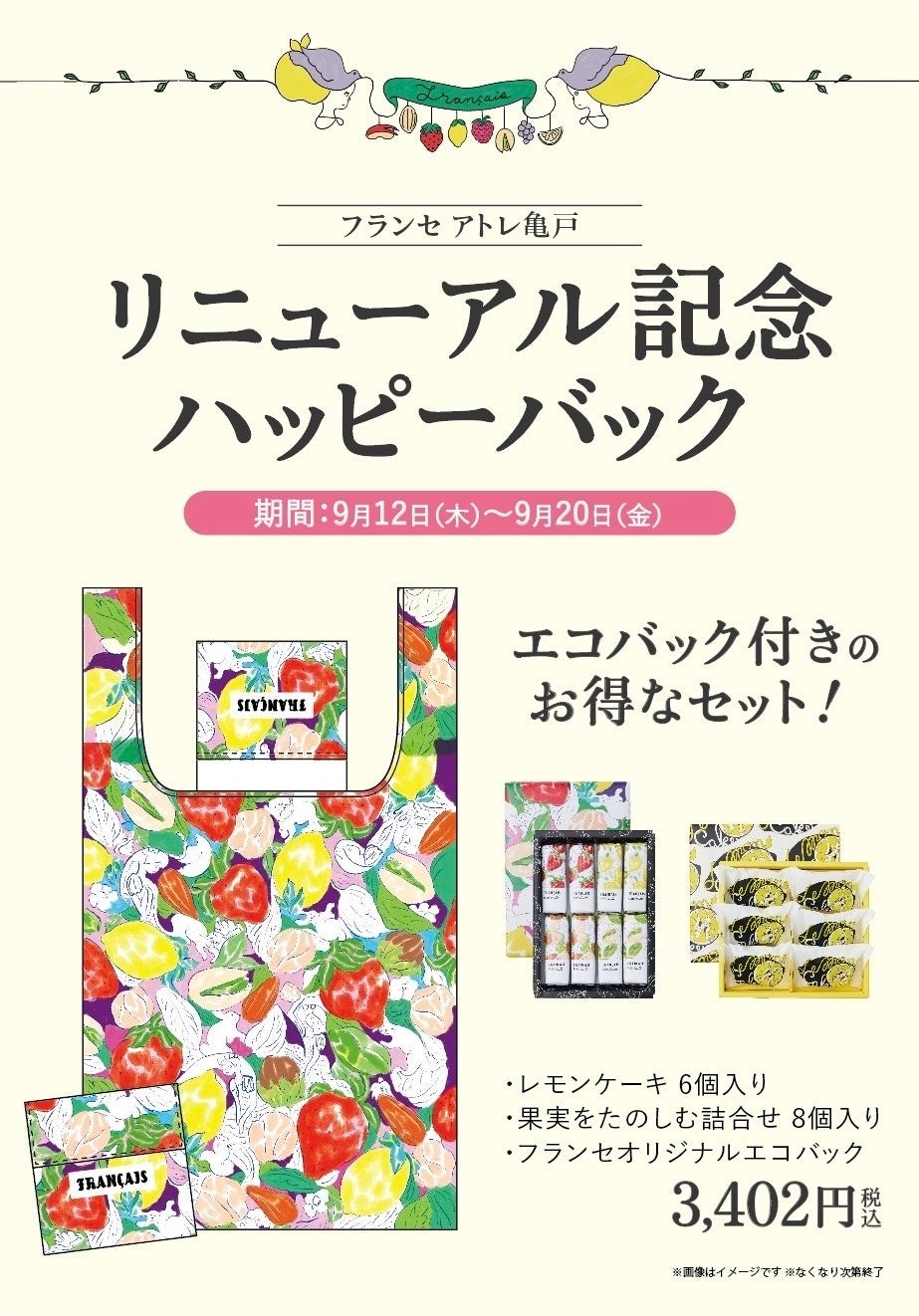 オリジナルのエコバッグがもらえるリニューアルハッピーバッグをご用意してお待ちしております。「アトレ亀戸」にお立ち寄りの際はぜひとも「フランセ」にお立ち寄りください。心より待ちしております。