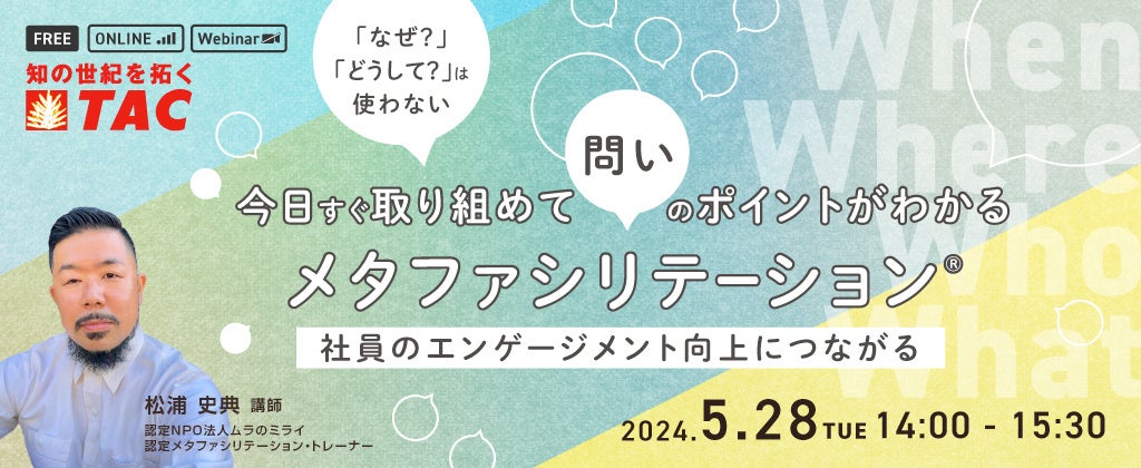 公認会計士や税理士など、多くの国家資格や検定試験の受験指導などの教育事業を展開しているTAC株式会社(東京都千代田区、代表取締役:多田敏男)は、法人向け人材教育部門から、人事・教育担当者に向けて、すぐ取り組め「問い」のポイントがわかるメタファシリテーションセミナーを2024年5月28日(火)に実施します。