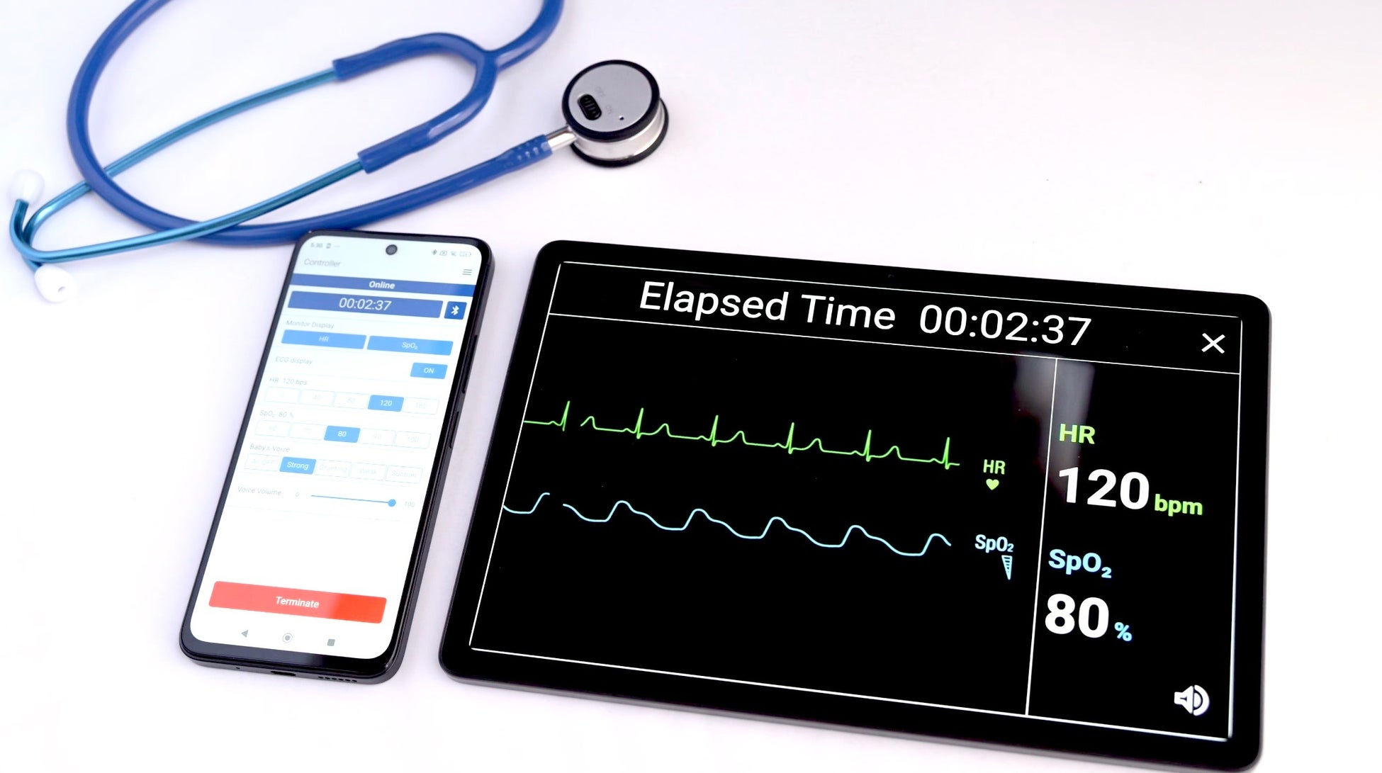 訓練用聴診器はチェストピースを新生児マネキンにあてた時のみ、講師が任意で設定したシナリオと連動した心音の聴診ができます。また、模擬モニターであるタブレットには心拍数・酸素飽和度・心電図波形が表示され、訓練生の処置状況を見て講師はコントローラーによるバイタル情報を変更できます。さらに模擬モニターで、新生児の泣き声を再生することが可能です。専用のアプリケーションを、市販されているスマートフォンやタブレットにインストールするだけで使用できるため、従来のシミュレーターと比較して低コストで導入できます。