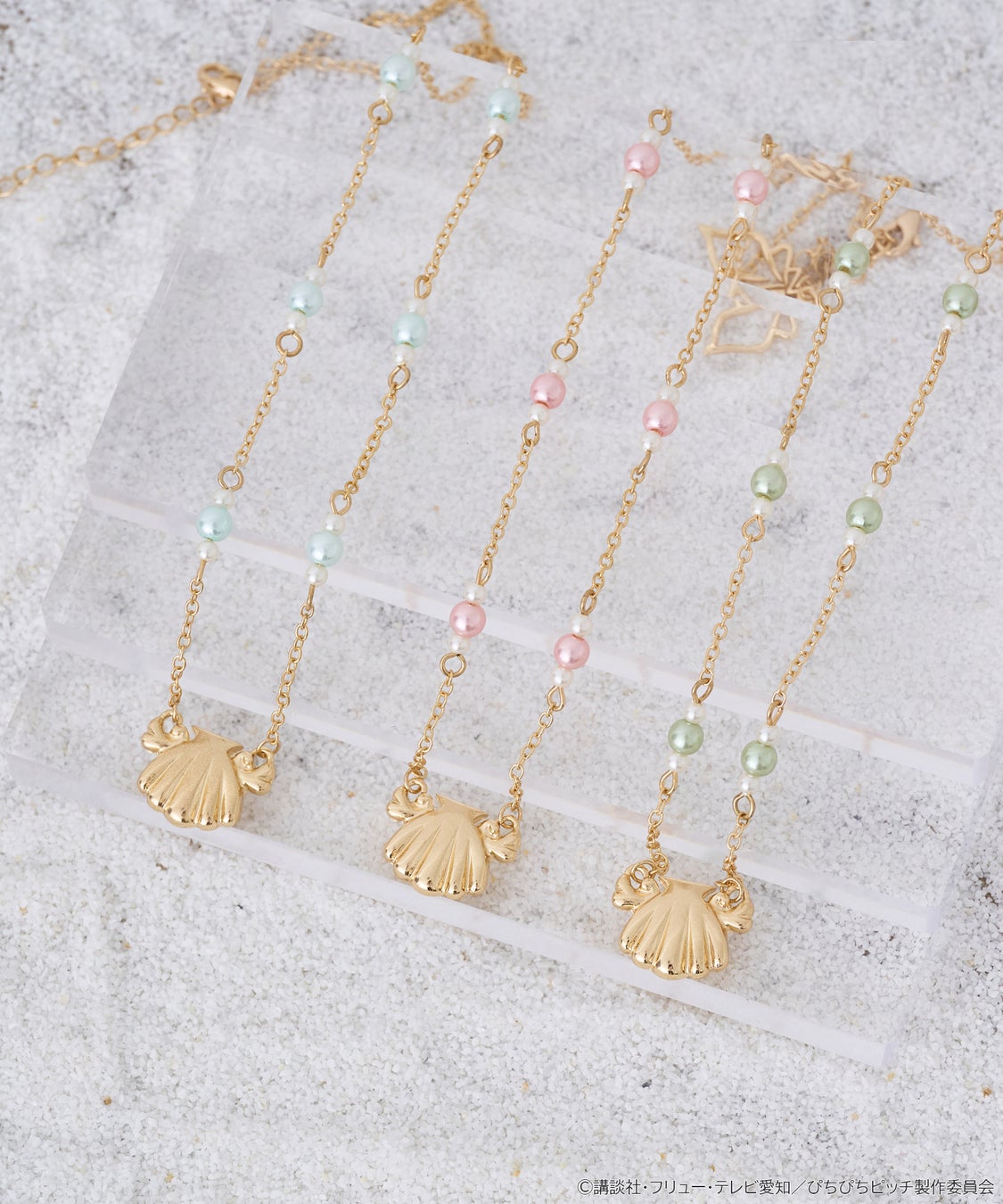 ゴールドの貝殻モチーフに、各キャラクターカラーのパールを取り付けました。