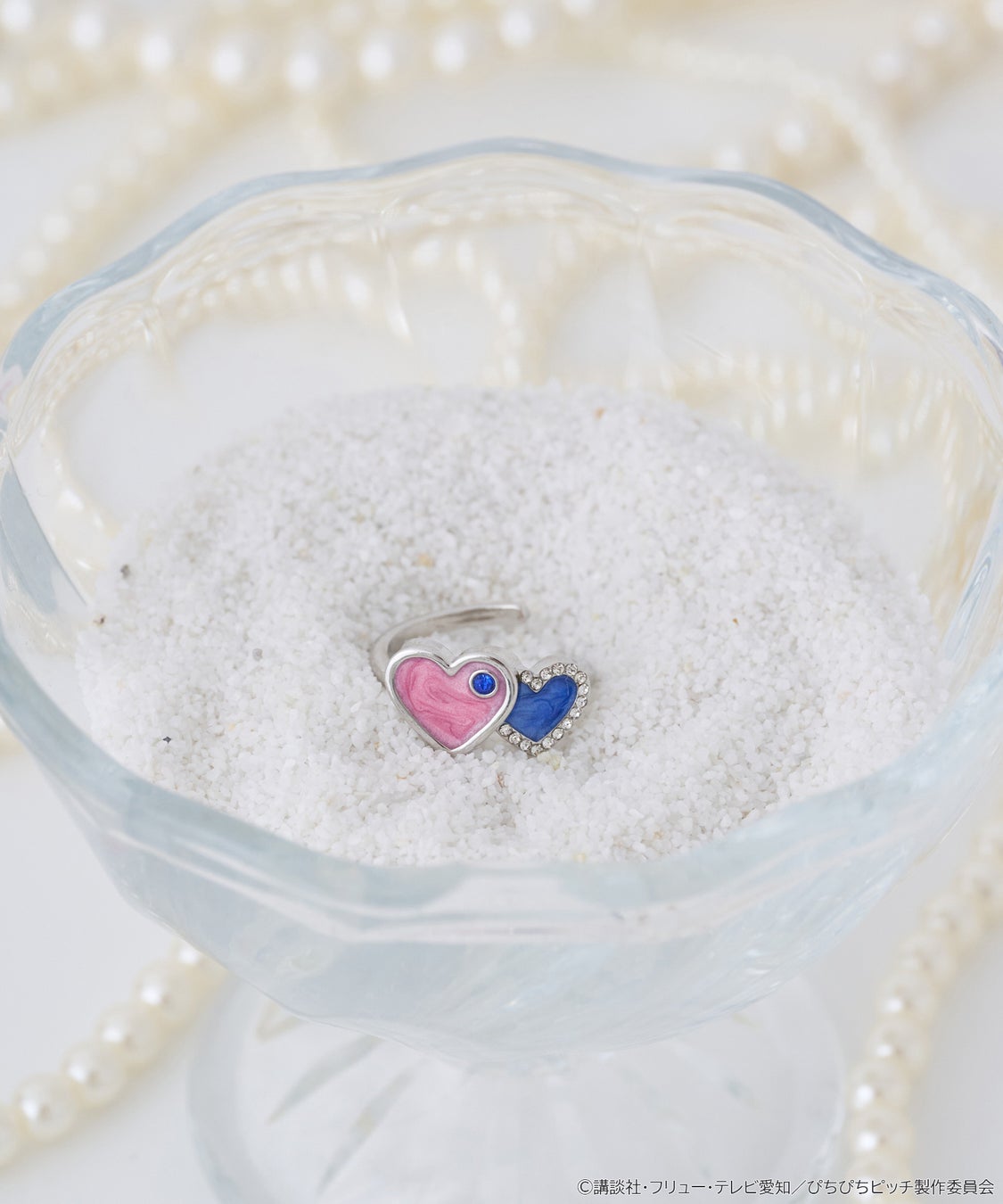 「海斗」が「るちあ」に贈った指輪のデザインをオマージュしました。ハート部分はガラス素材で海を連想させる透明感ある作りに仕上げました。サイズは調節可能なフリーサイズで、人魚の尾ひれがポイント。オリジナルボックス&巾着入りで、ワンランク上の特別なリングです。