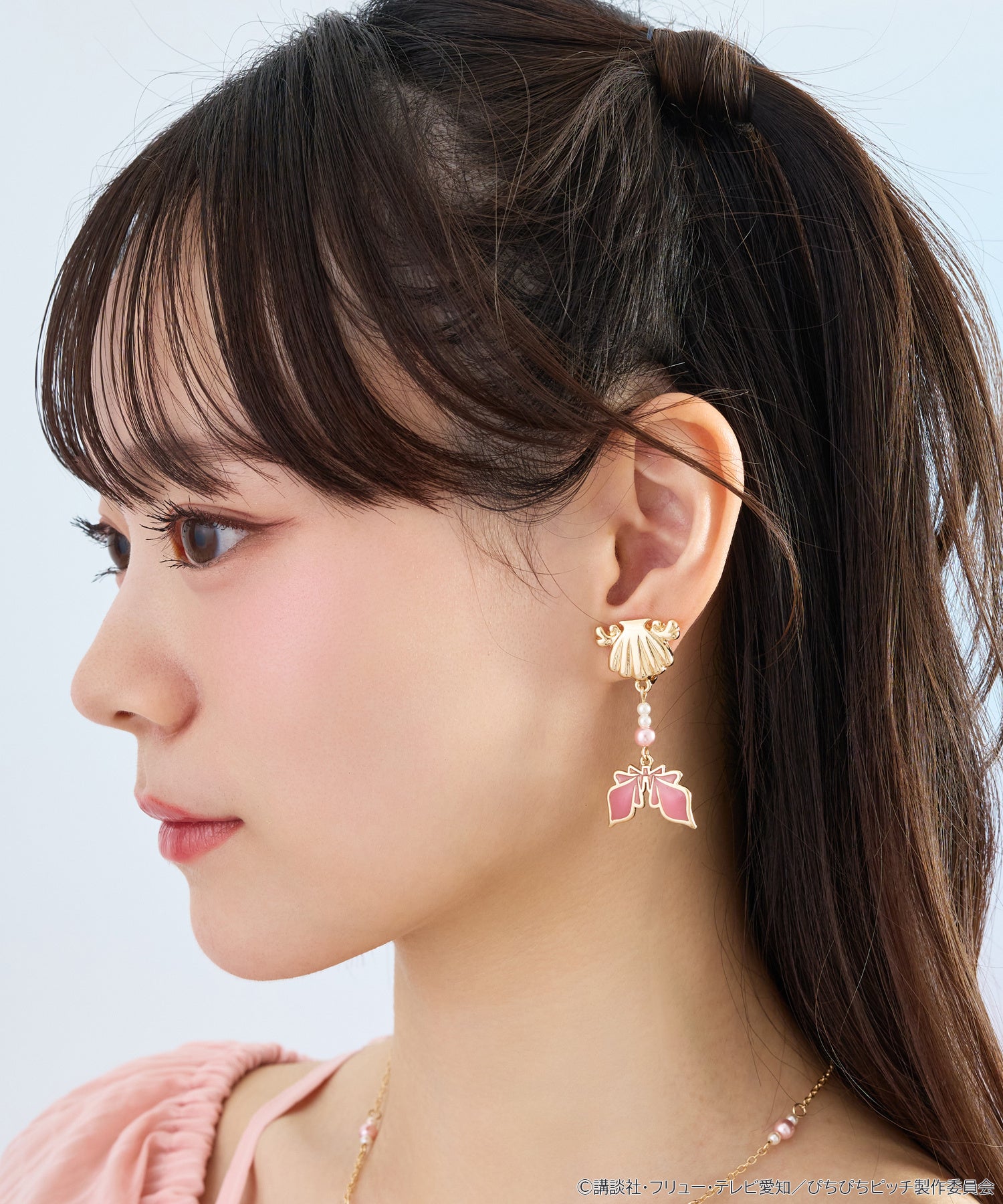 全アイテムには、主人公るちあをはじめ、波音、リナのイメージカラーやモチーフを採用しました。作中衣装をモチーフにしたブラウスや、ネーム刺繍とラインストーンをあしらったバッグ、変身アイテム「アクアピッチ」をモチーフにしたポーチをラインナップ。また、マーメイドの尾ひれや貝殻のディテールを取り入れたイヤリングとネックレスもご用意いたしました。さらに、ピンクとブルーのハートが上品に輝くプリンセスリングも販売。作中で海斗がるちあに贈った指輪のデザインをオマージュした、ファン必見のアイテムです。