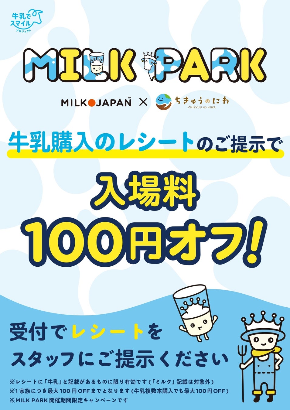 MILK PARK開催期間中に牛乳を購入したレシートをご提示いただくと、入場料が100円割引になるキャンペーンを実施します。