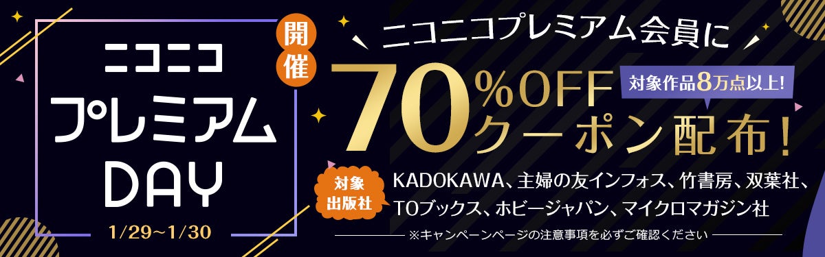 「ニコニコプレミアムDAY」連動キャンペーン! 70%OFFクーポン配布!~7出版社8万点以上が対象~