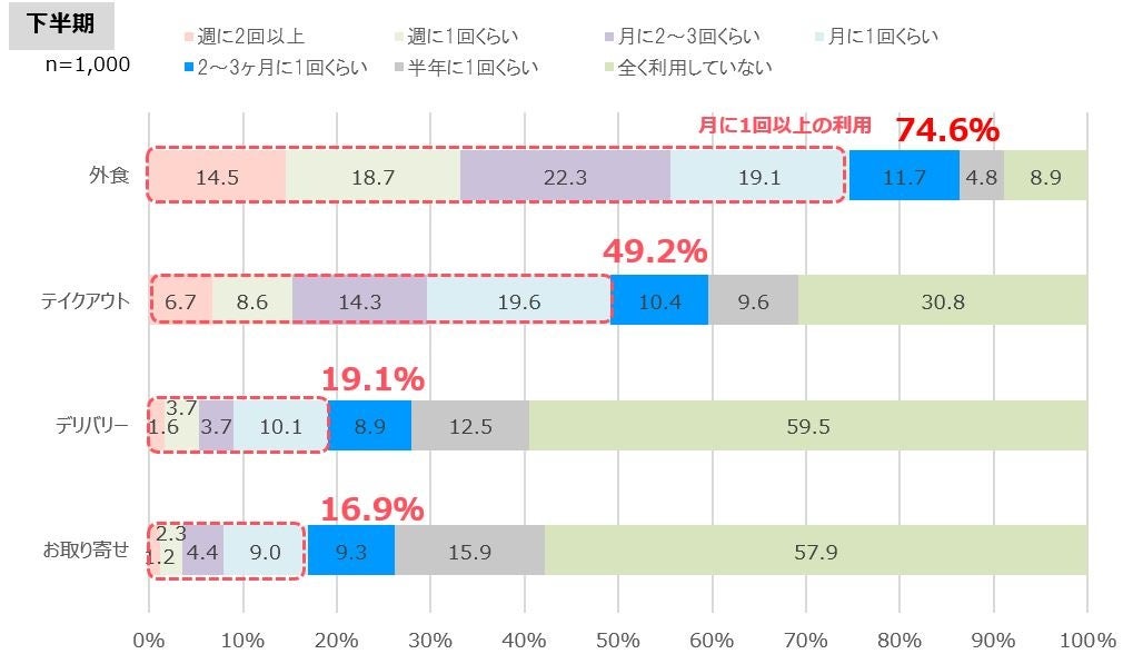 ・外食の利用頻度は、月に1回以上が上半期に比べて約6%増加。