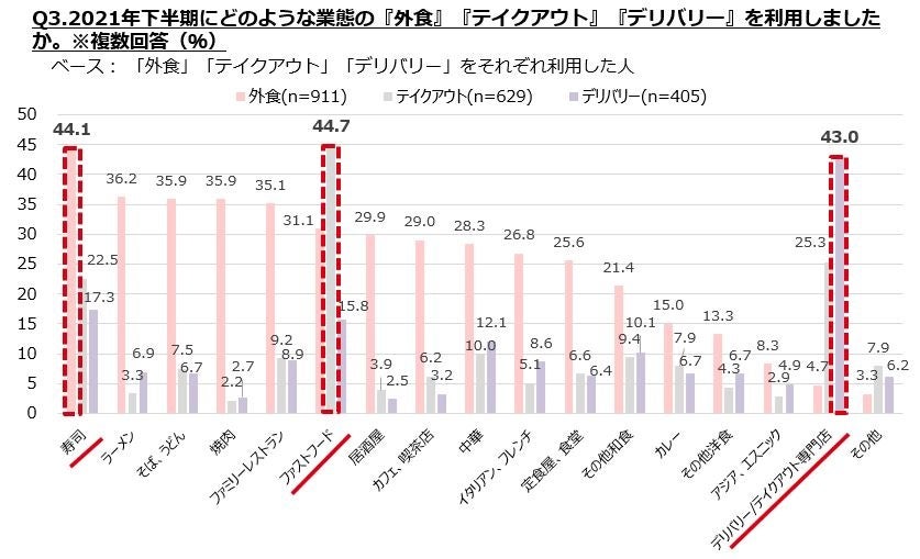 ・利用した業態では、外食は「寿司」、テイクアウトは「ファストフード」、デリバリーは「デリバリー/テイクアウト専門店」が最多、また、上半期との比較では、「居酒屋」の利用が約11%の増加。