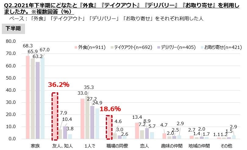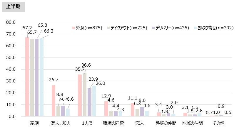 ・外食利用時の相手では、上半期と比べて「友人、知人」が約10%増加、「職場の同僚」は約6%増加。