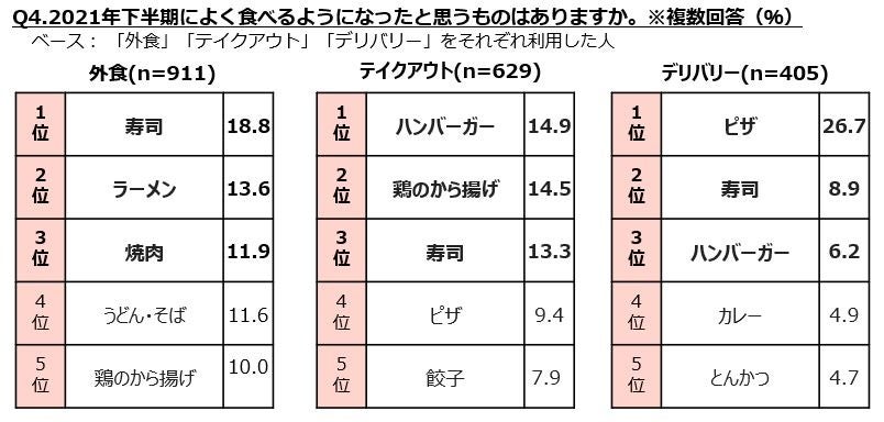 ・下半期によく食べるようになったメニューは、外食が「寿司」「ラーメン」「焼肉」、テイクアウトが「ハンバーガー」「唐揚げ」「寿司」、デリバリーが「ピザ」「寿司」「ハンバーガー」と、全シーンで「寿司」が上位に。