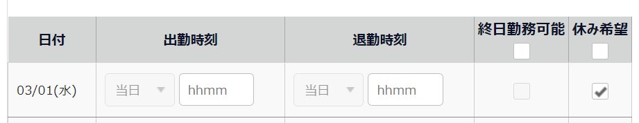 画面で従業員の「休み希望」を確認しながらシフトを調整できます。休み希望だけ提出し、残りのシフトに特に希望がない場合など、従業員の希望提出の方針に合わせてご利用いただけます。