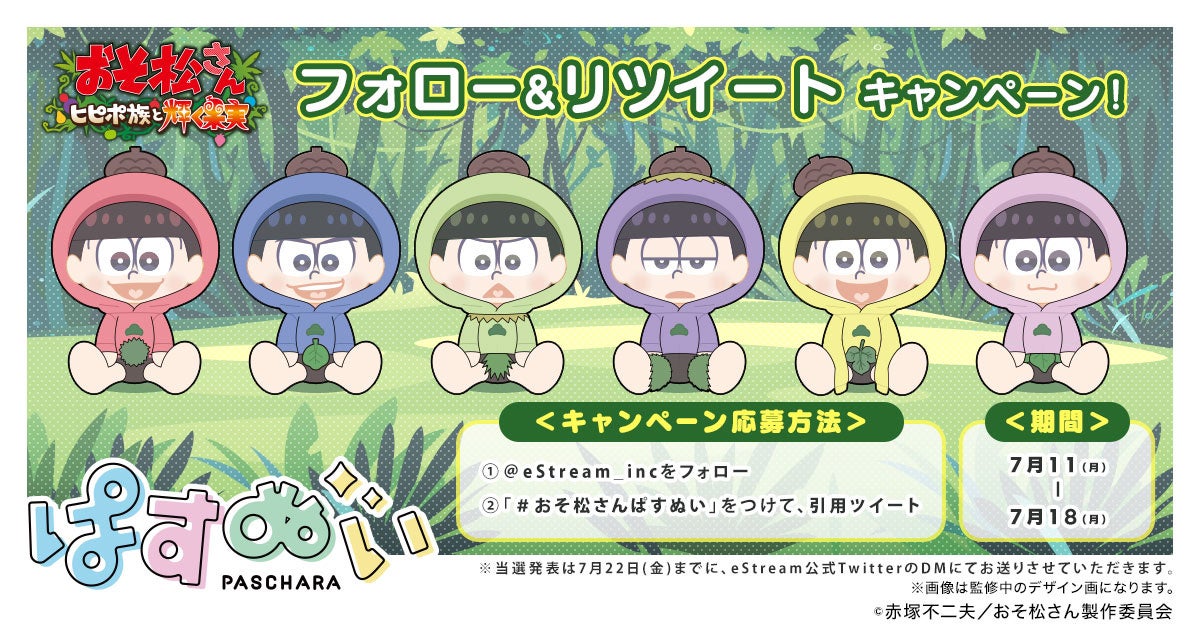株式会社CyberZ(本社:東京都渋谷区、代表取締役社長:山内隆裕)の連結子会社、株式会社eStream(本社:東京都渋谷区、代表取締役社長:高井里菜))は、新作アニメ「おそ松さん~ヒピポ族と輝く果実~」とeStreamオリジナルデフォルメキャラクターシリーズ『ぱすきゃら』がコラボしたぬいぐるみ(通称:ぱすぬい)を7月11日(月)よりeStream Storeにて予約販売開始いたします。『ぱすぬい』とは、パステルカラーの色合い・丸みのあるシルエット・大きな瞳が特徴のシリーズ『ぱすきゃら』とコラボしたぬいぐるみです。