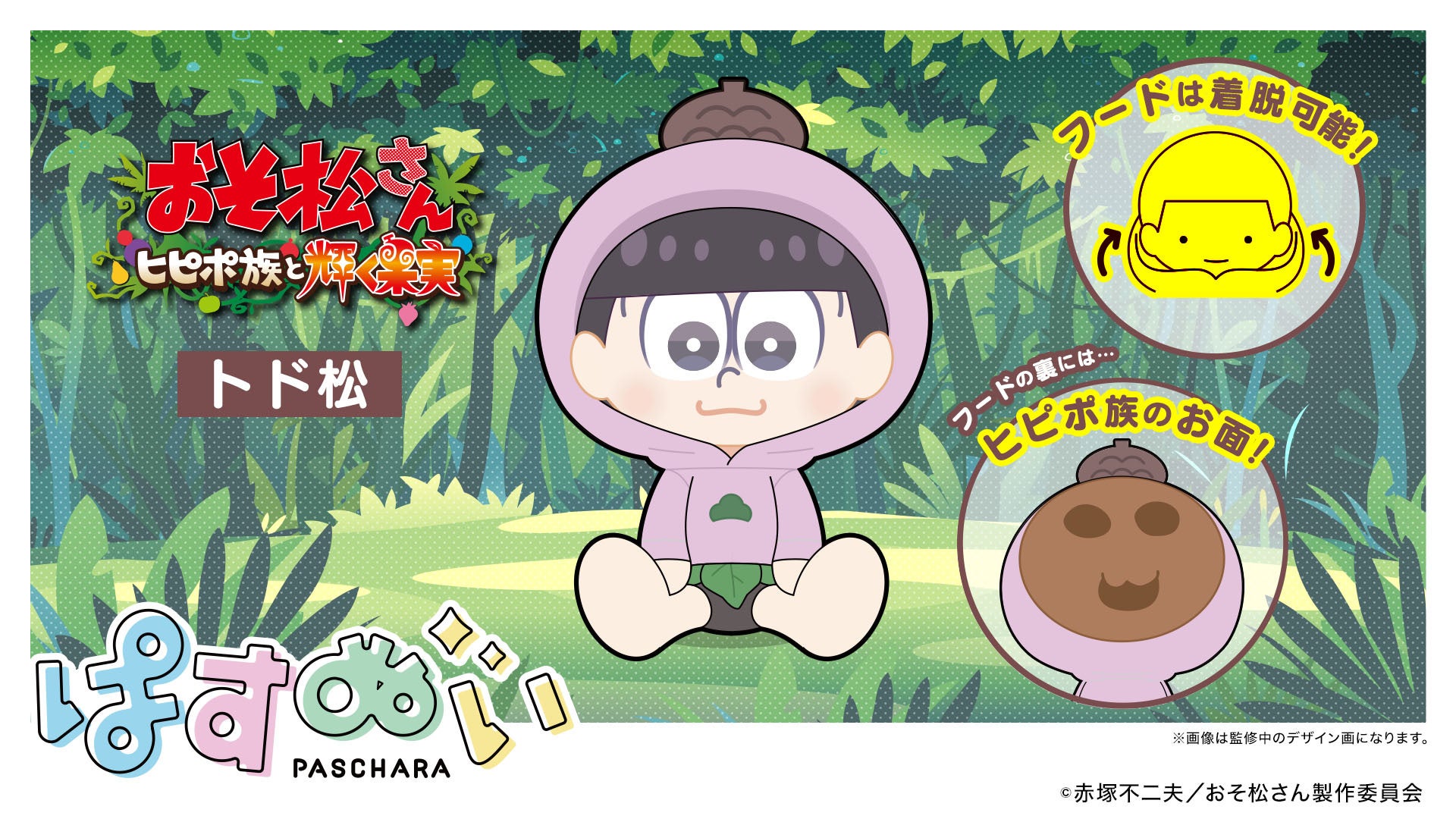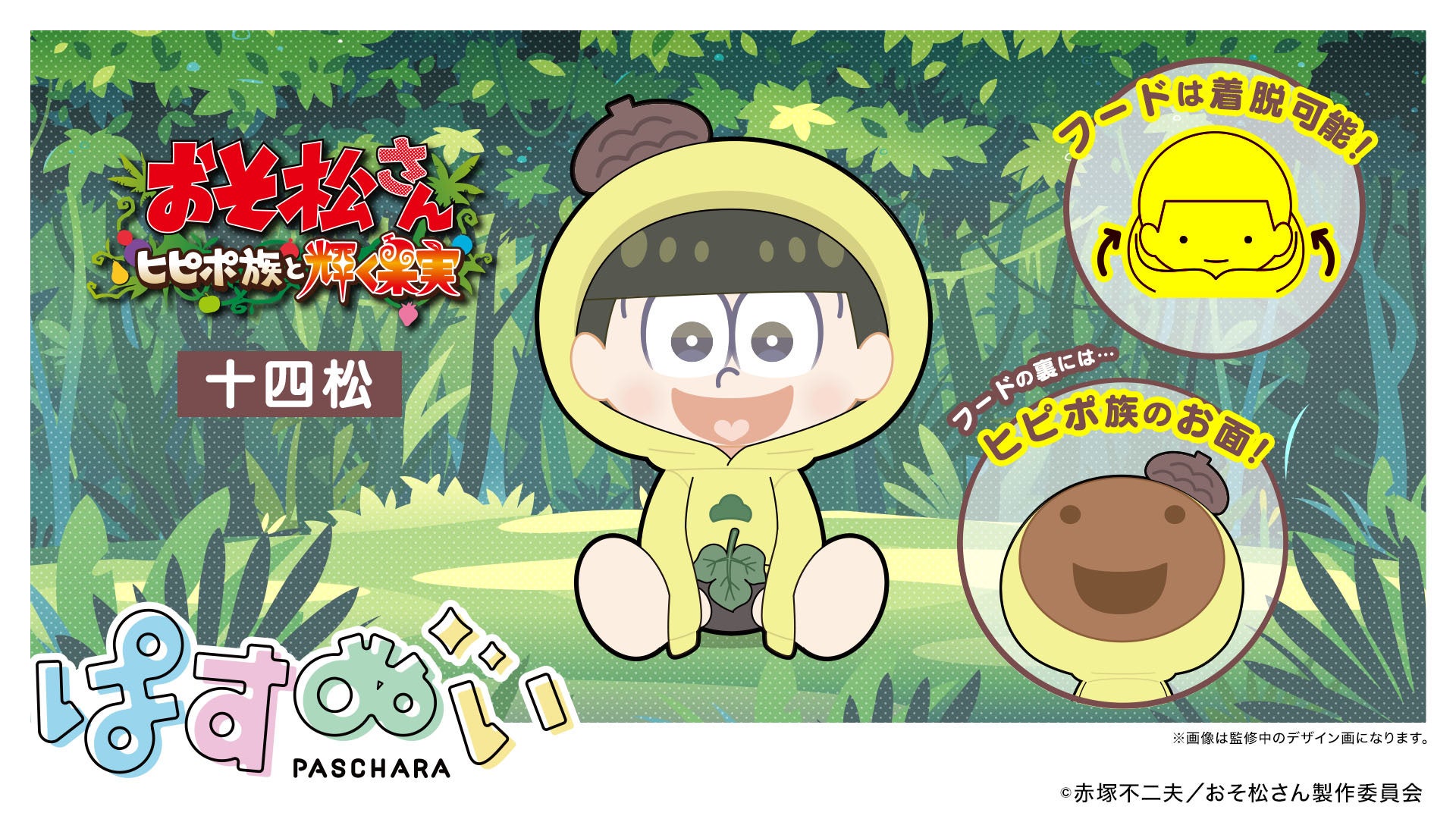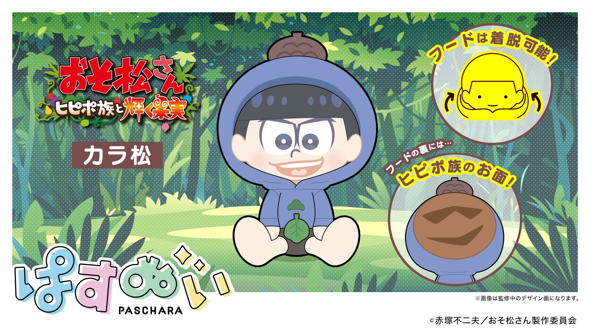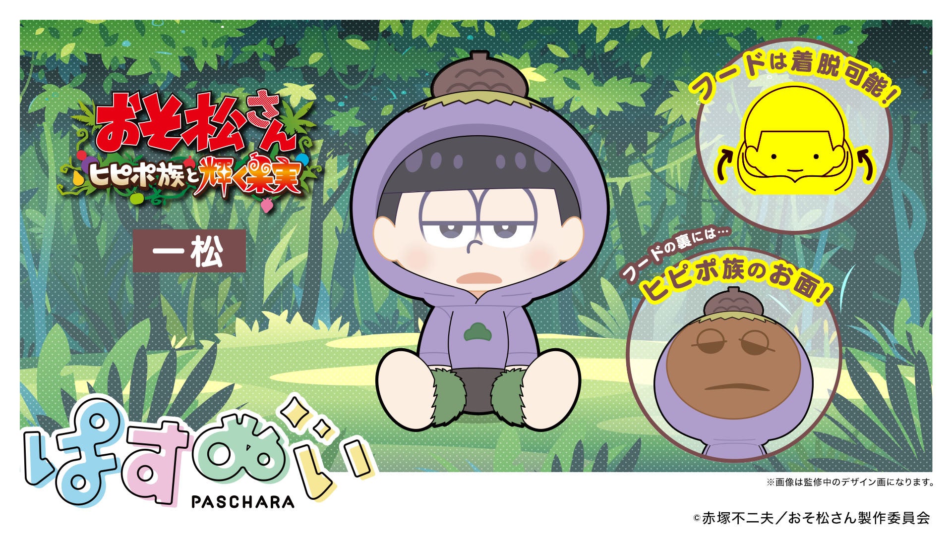 新作アニメ「おそ松さん~ヒピポ族と輝く果実~」内の衣装を纏った「おそ松」「カラ松」「チョロ松」「一松」「十四松」「トド松」が、『ぱすきゃら』となったオリジナル描き起こしイラストを使用し、ぬいぐるみとなって登場いたしました。