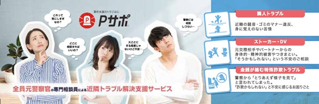 元警察官が相談員として、「騒音」「迷惑行為」「つきまとい行為」「SNSによる誹謗中傷」など、「事件未満(事件化前)のトラブル」を解決支援するサービスです。警察官時代に培われた専門的な知識と豊富な現場経験で、迅速かつ的確に対応します。登録後、お電話またはメールでの相談が可能です。