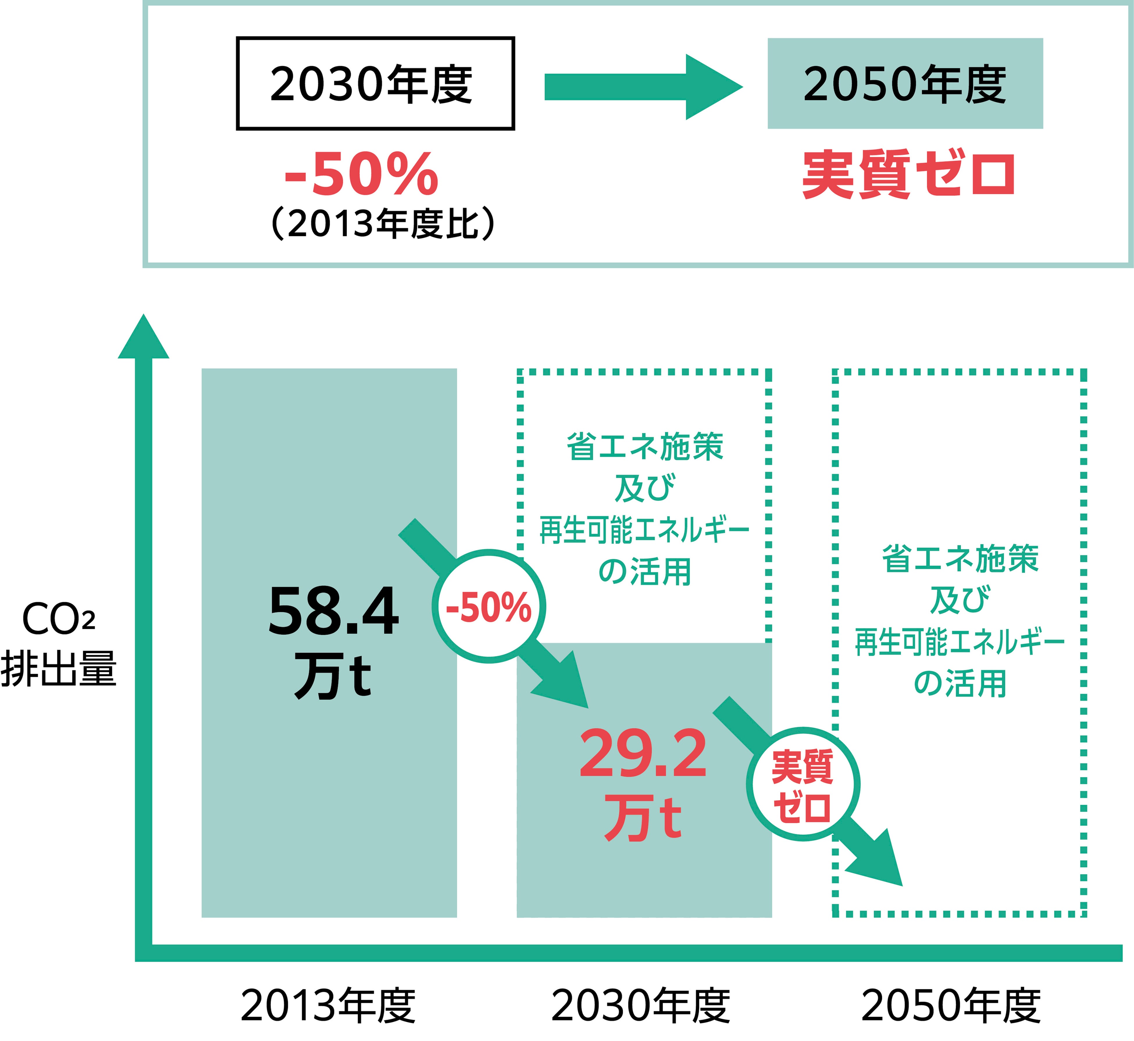東京メトログループ全ての事業における先端技術の採用や改善活動等の創意工夫により、再エネの活用や更なる事業の省エネ化を通じ、東京メトログループ全事業が排出するCO₂量について「2030年度-50%(2013年度比)、2050年度実質ゼロ」を目指します。