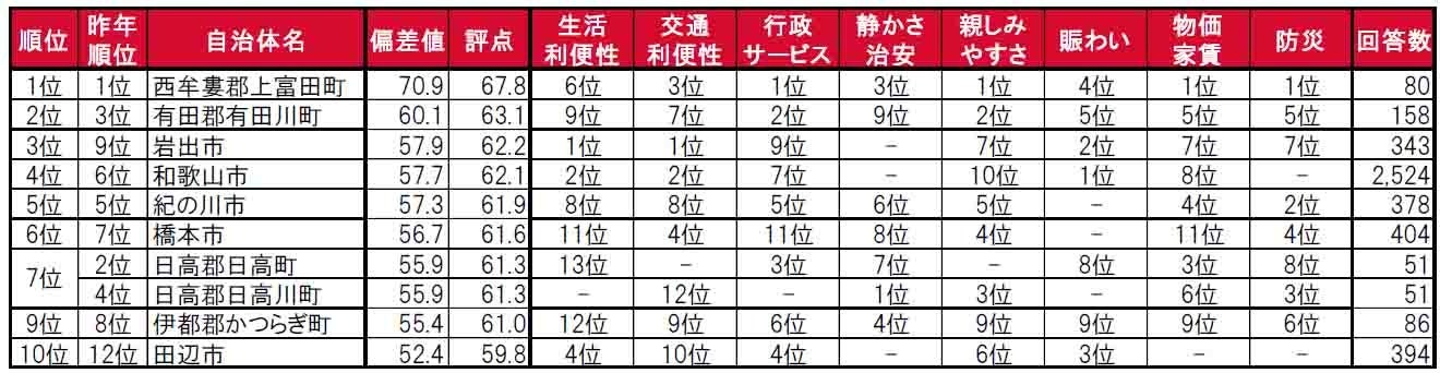 街の住みここちランキング2024<和歌山県版>自治体TOP10 因子別順位
