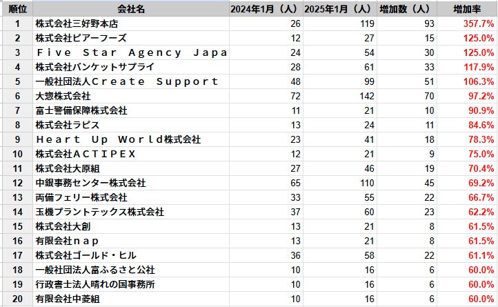 ・2024年1月時点と2025年1月時点の従業員数を比較
