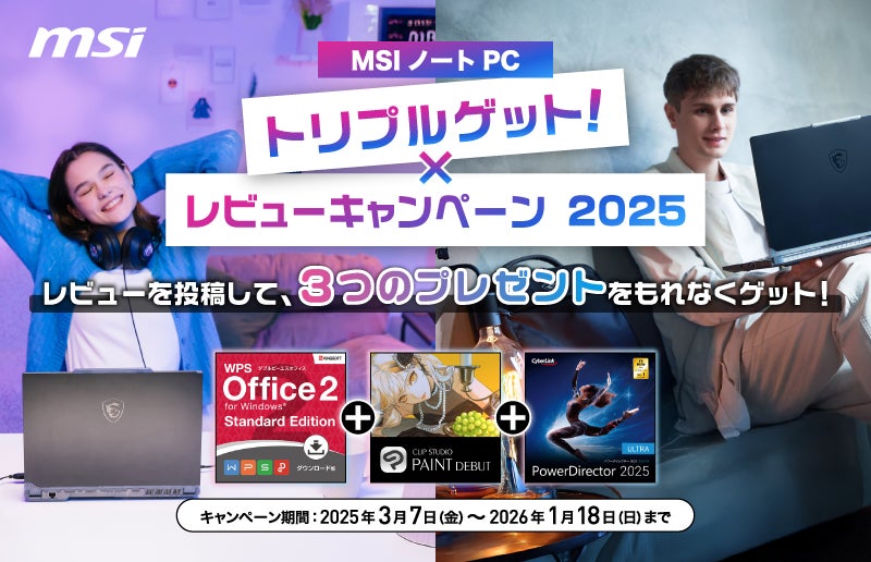 この度、エムエスアイコンピュータージャパン株式会社は、2025年3月7日(金)~2025年5月11日(日)の期間中に対象のMSIノートPC製品のご購入でMSIオリジナルグッズが必ず貰える『MSI ノートPC 新生活応援キャンペーン2025』を開始いたします。また、同日より、対象のノートPC製品購入とレビュー投稿で「WPS Office 2」「CLIP STUDIO PAINT DEBUT 1デバイスプラン(12ヶ月版)」「PowerDirector 2025 Ultra」の3点が必ず貰える『MSIノートPC トリプルゲット!レビューキャンペーン 2025』を開催いたします。