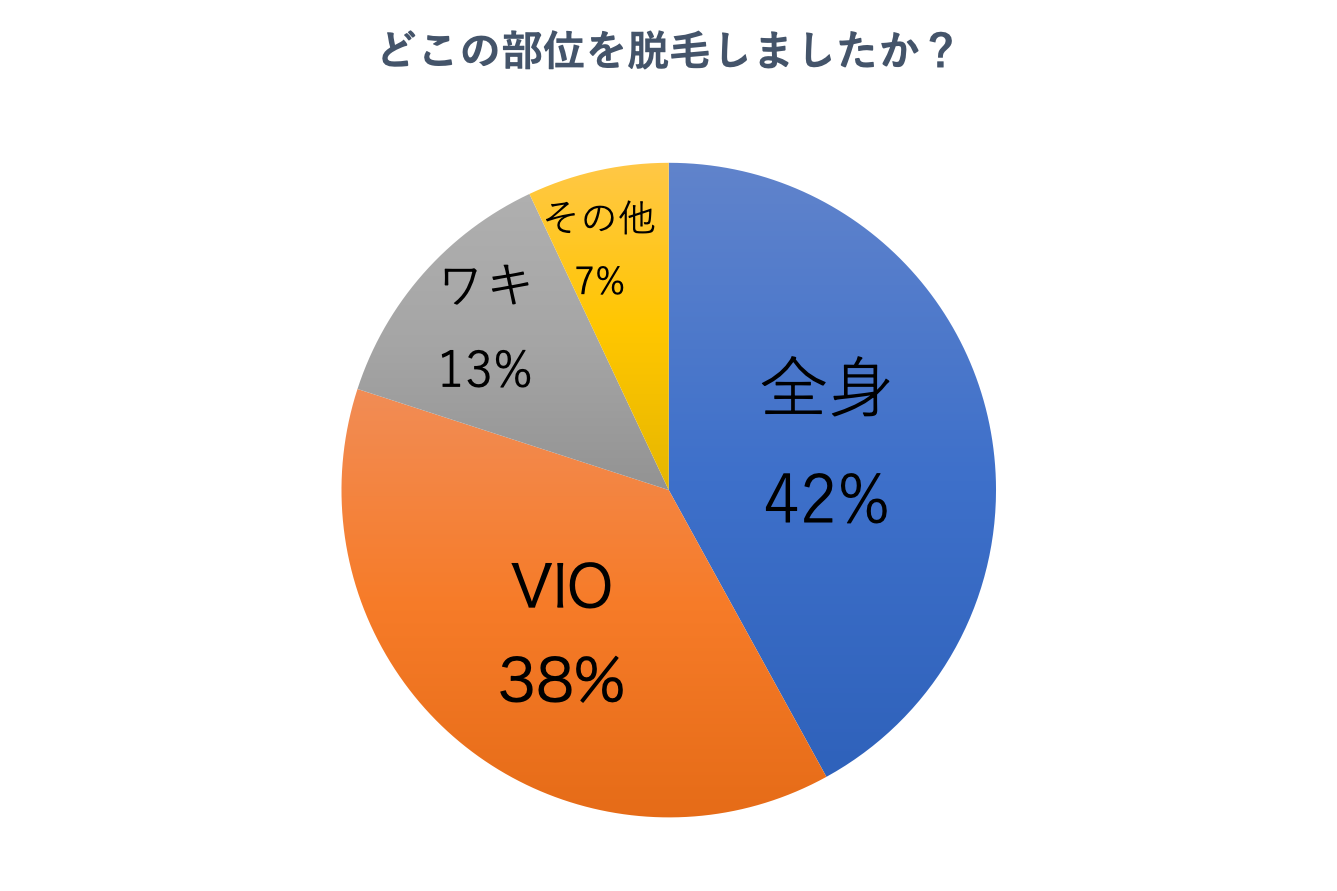 という結果となりました。全身脱毛が1番多い結果となり、全身ムラなく脱毛したいという方が一番多かったです。続いてはVIO脱毛。季節を問わずに脱毛しやすい箇所なことや、アンダーヘアの身だしなみを整えるという新常識が近年根付いてきているように見受けられました。