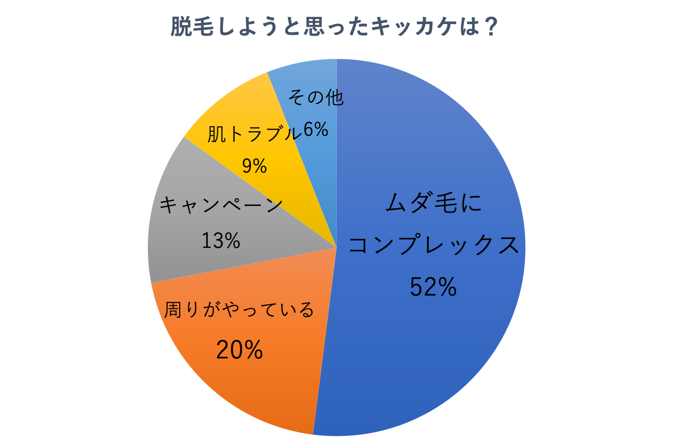 一位は"ムダ毛がコンプレックス"だという声でした。続いて、周りの方が脱毛をしているからという声も挙がりました。その他では「異性からの目が気になったから」「自己処理の手間をなくしたい」「友人からの勧め」等の回答が挙がりました。