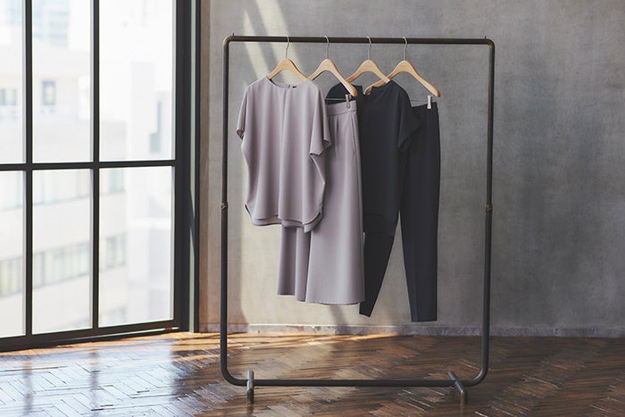キレイな見た目とストレッチ性やシワになりにくい快適性を兼ね備えたリラックス素材のセットアップ、そして同素材のワンピースをご紹介いたします。セットアップはスキッパーデザインとリラックスシルエットの2タイプが、ボトムもシルエット違いで2タイプを展開。お好みで組み合わせを選んでいただけます。