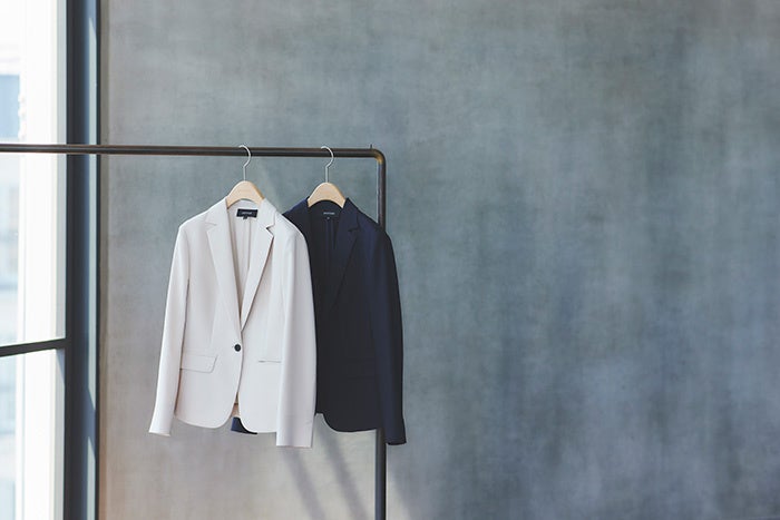 これから夏に向けてお勧めしたい、清涼感のあるドライタッチのシャリ感のある風合いが特徴のライトジャケットは、カラーレスとテーラードの2タイプを展開。どちらもウエストが程よくシェイプした女性らしいシルエットで、佇まいも美しく。
