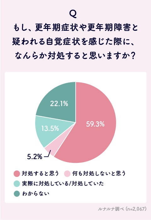 また、更年期症状を疑った際に対処をするかについて、更年期と思われる症状を感じたことが「ある」と回答した40代以上の回答を見てみると、「対処すると思う」59.3%、「何も対処しないと思う」5.2%、「わからない」22.1%となり、約6割がなんらかの対処をしようと考えてはいるものの、「実際に対処している/対処していた」は13.5%で約1割となりました。