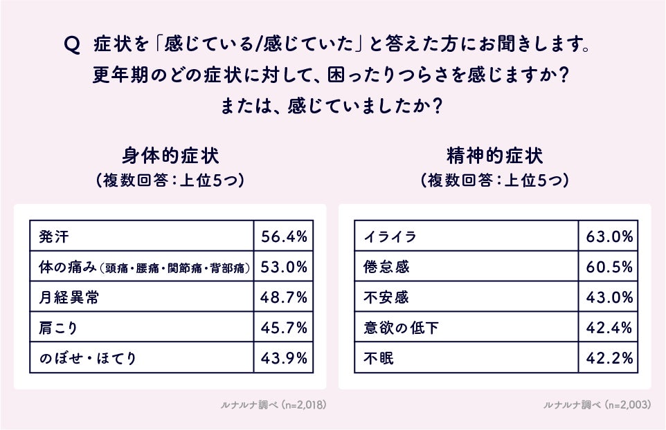 Q.「感じている/感じていた」と答えた方にお聞きします。あなたは、更年期のどの「身体的」「精神的」症状に対して、困ったりつらさを感じますか?または、感じていましたか?(複数回答)