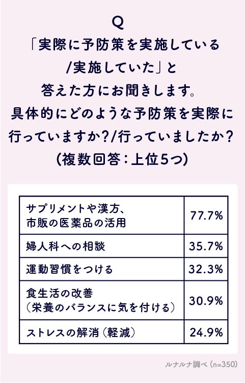 また、更年期の症状を感じている・感じたことがある人で、予防策を実施している・実施していた人に、具体的な内容を聞いてみると、「サプリメントや漢方、市販の医薬品の活用」が77.7%で最も多く、約8割が市販の医薬品などで予防を講じていることが分かります。次いで、「婦人科への相談」35.7%、「運動習慣をつける」32.3%、「食生活の改善(栄養のバランスに気を付ける)」30.9%、「ストレスの解消(軽減)」24.9%と、医療機関の受診のほか、実際に更年期と診断された人と同様に、予防策においても心身の状態をよりよく保つように心がけている人が多いことが分かりました。バランスの良い食事や、適度な運動、ストレスをためないためのリフレッシュなど、日ごろからできることが予防にもつながりますので、ぜひ実践してみてほしいです。