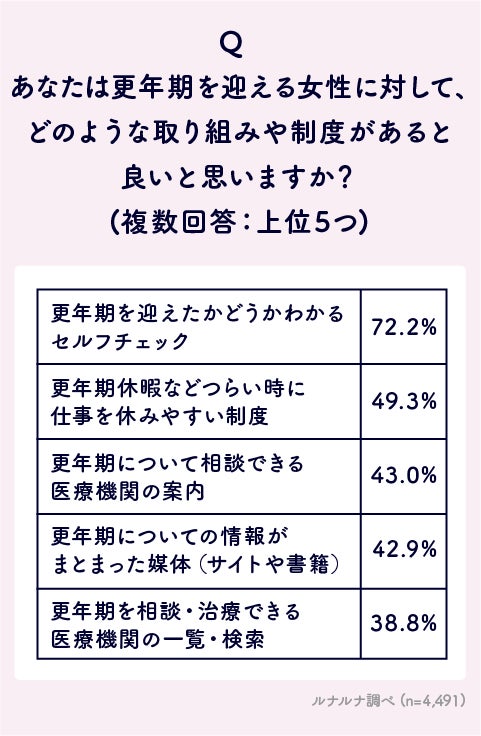 Q. あなたは、更年期を迎える女性に対して、どのような取り組みや制度があると良いと思いますか?(複数選回答)