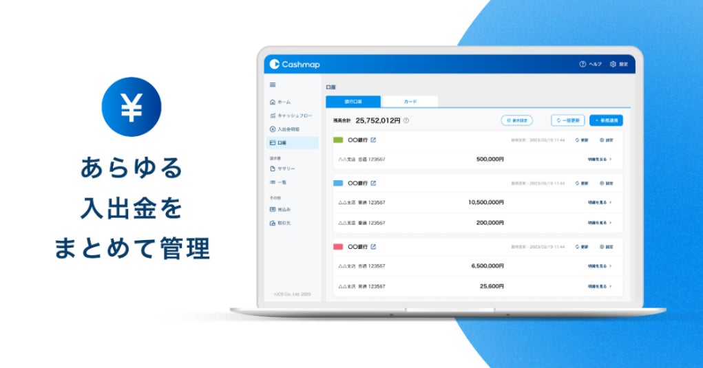 株式会社ジェーシービー (本社:東京都港区、代表取締役兼執行役員社長:二重 孝好、以下:JCB)は、2025年3月4日より中小企業・個人事業主向け資金管理・キャッシュフロー改善ポータル『Cashmap』の提供を開始いたします。