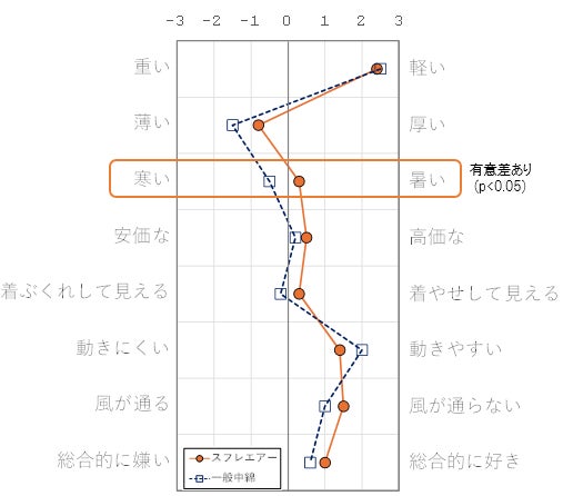 ▼中綿のみ変更した2種類のコートの着用感評価結果