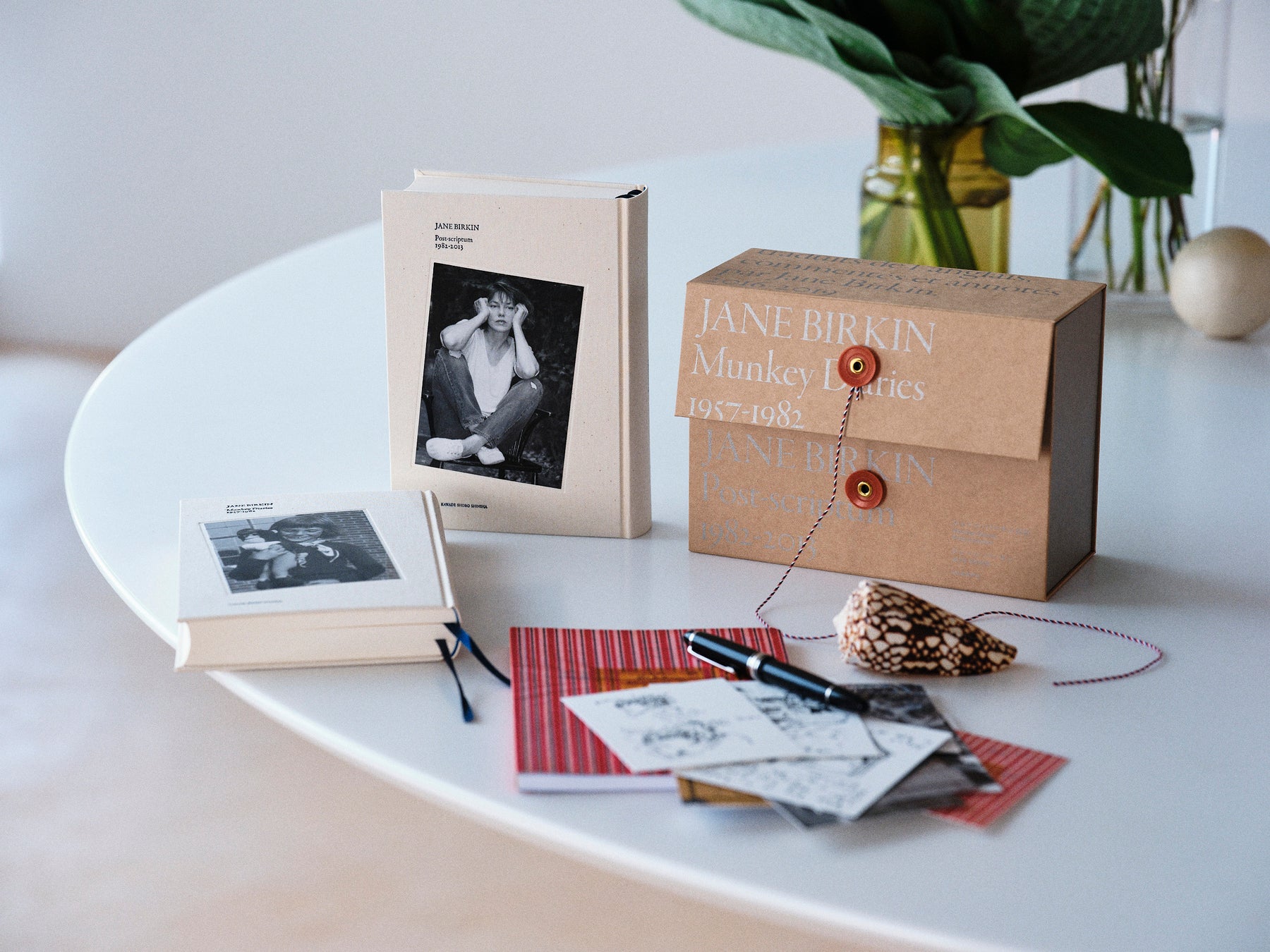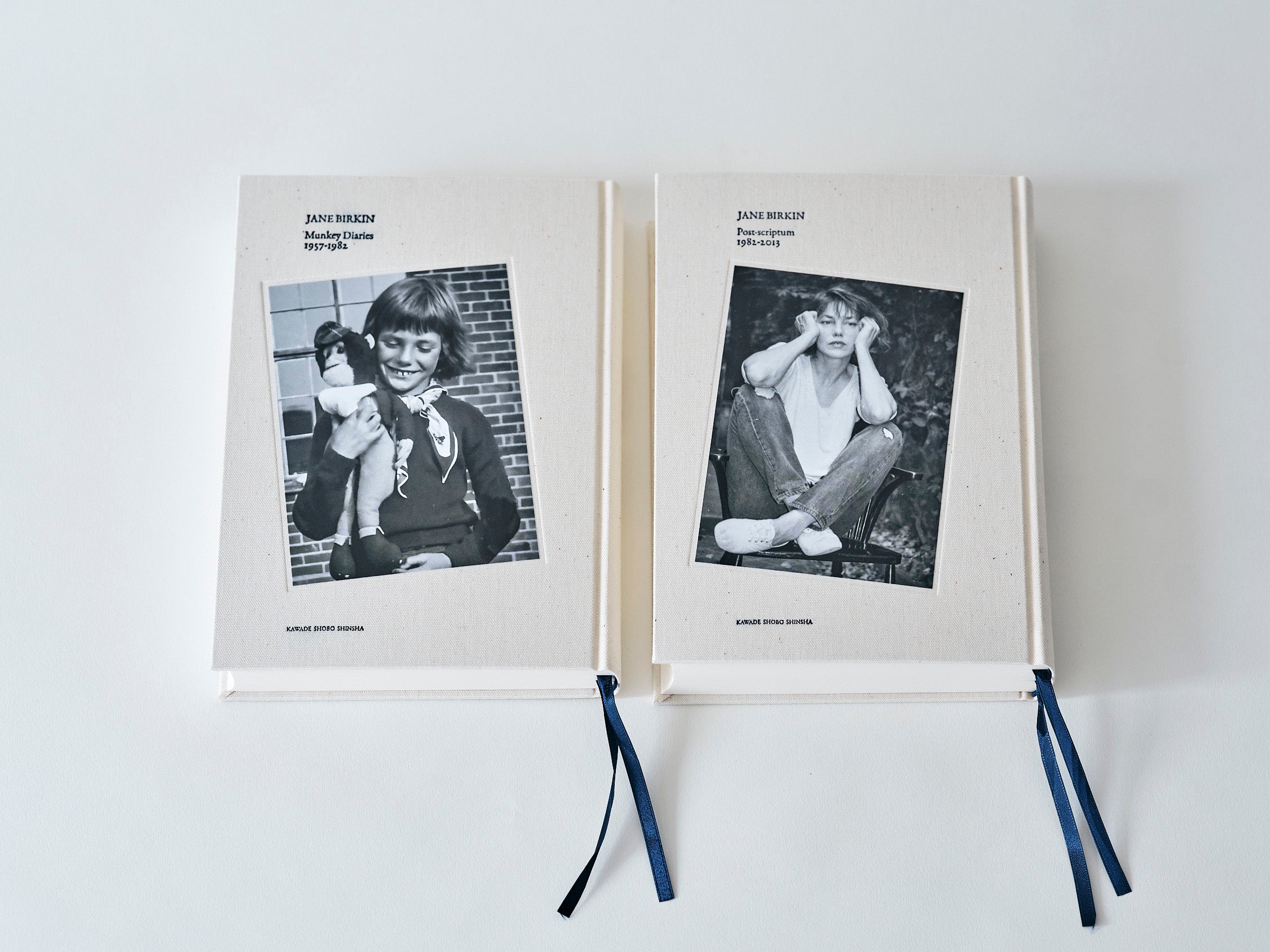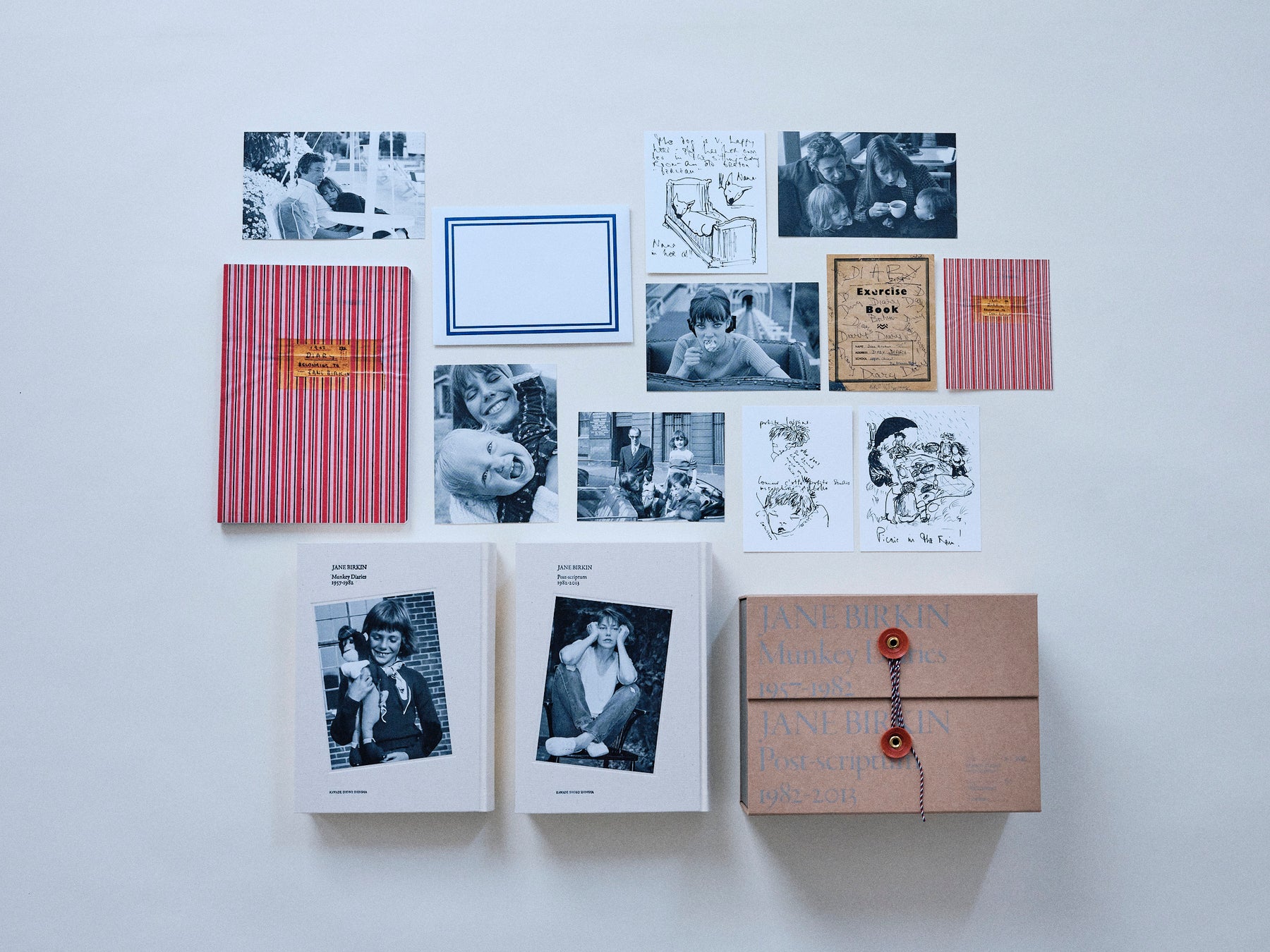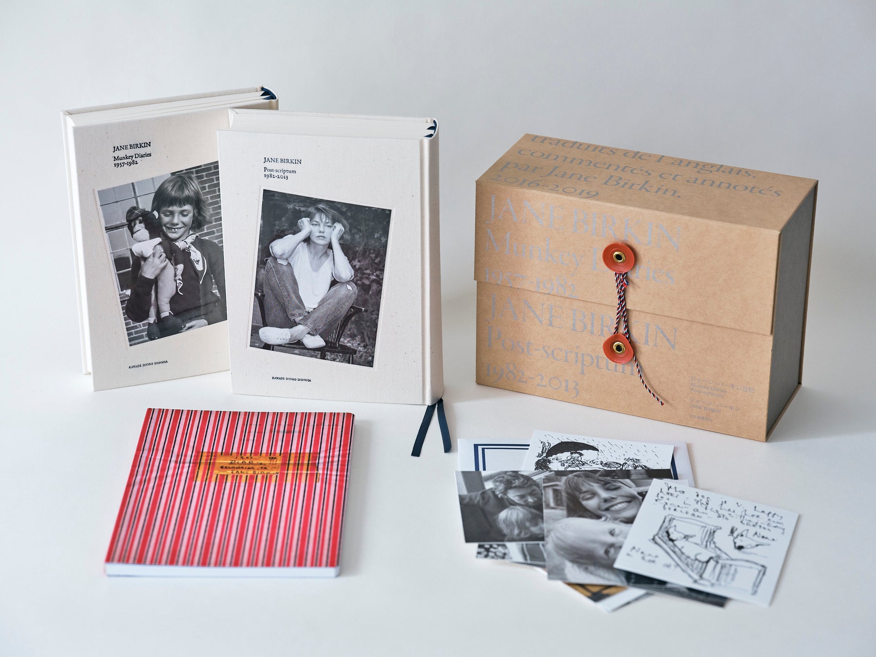 上巻『Munkey Diaries(マンキーダイアリーズ)』、下巻『Post-scriptum(ポスト・スクリプトゥム)』の日記2冊と、2種類の豪華特典、クオバディス × ジェーン・バーキン「オリジナルノートブック」、「オリジナルポストカード」10枚が特製函に収まった、いずれもこの商品でのみ入手可能な限定生産アイテムです(税込定価19,800円)。