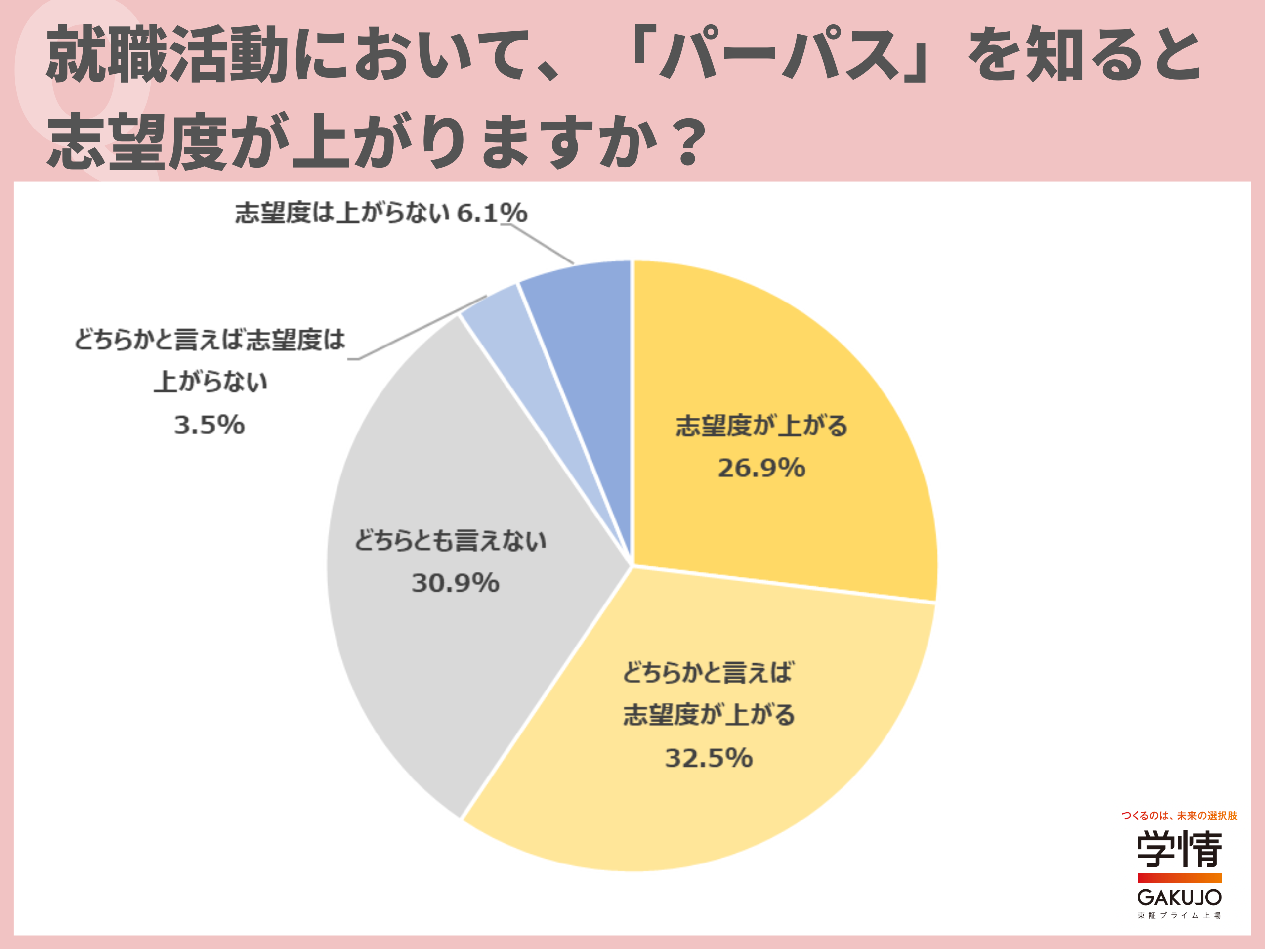 就職活動において、企業の「パーパス」を知ると「志望度が上がる」と回答した学生が26.9%に上りました。「どちらかと言えば志望度が上がる」32.5%を合わせると、6割に迫る学生が、企業の「パーパス」を知ると「志望度が上がる」としています。「企業がどのような方向性を目指しているか知ることができる」「自身の価値観と合致するか、照らし合わせることができると思う」「自身が大切にしたいことと、企業のパーパスが重なると、志望度が上がる」といった声が上がりました。
