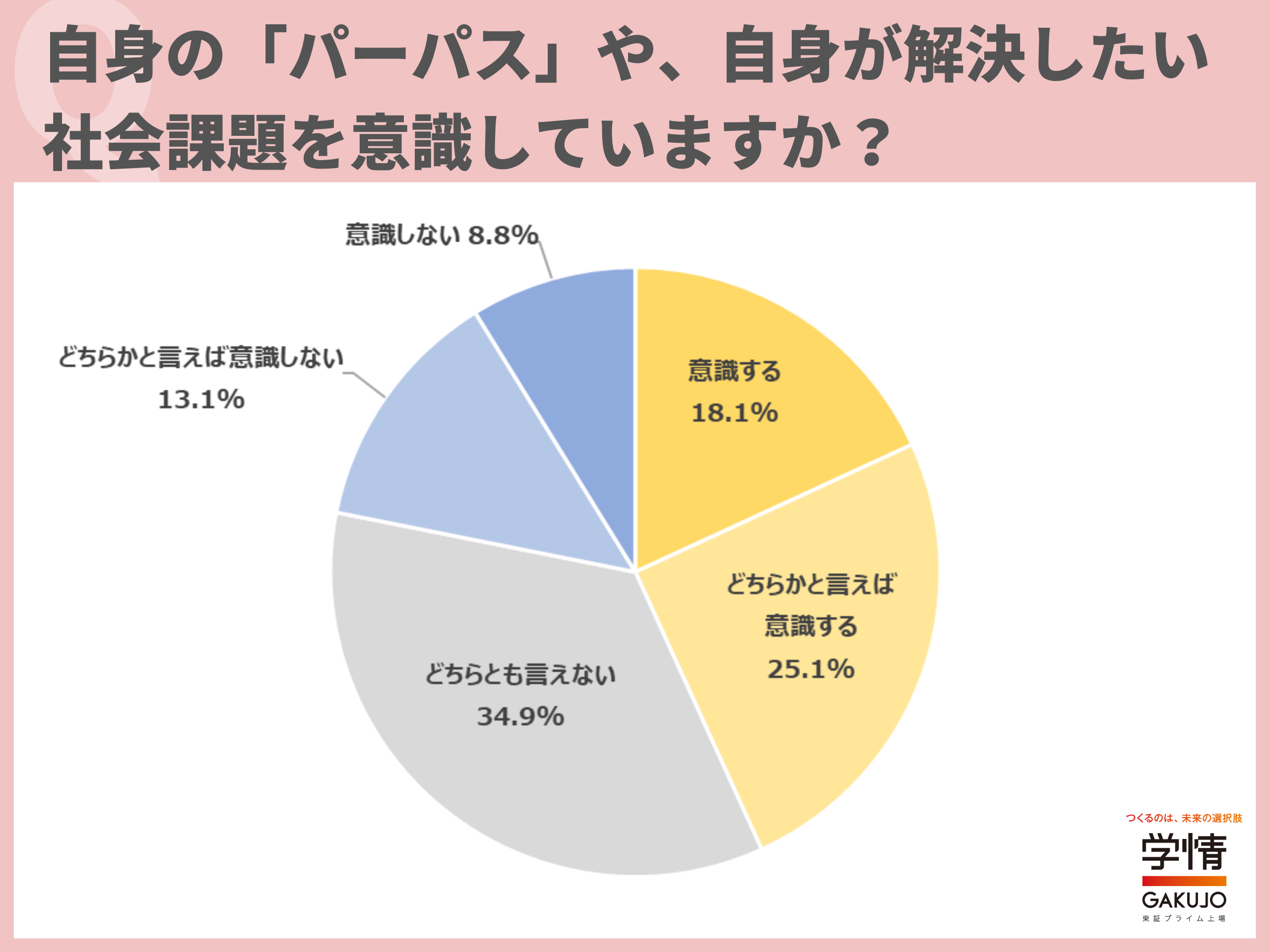 自身の「パーパス」や、自身が解決したい社会課題を「意識する」と回答した学生が18.1%に達しました。「どちらかと言えば意識する」25.1%を合わせると、4割を超える学生が自身の「パーパス」を意識するとしています。「まだ自分事として考えられる社会課題までは見つけられていないが、どのように社会に貢献するかを考えていきたいと思う」「実際に就職活動を進める上で、自身のパーパスや解決したい社会課題も見つけていきたい」「どのような企業に就職したいか考える上で、自身のパーパスや社会課題への関心も意識するようになった」といった声が寄せられました。