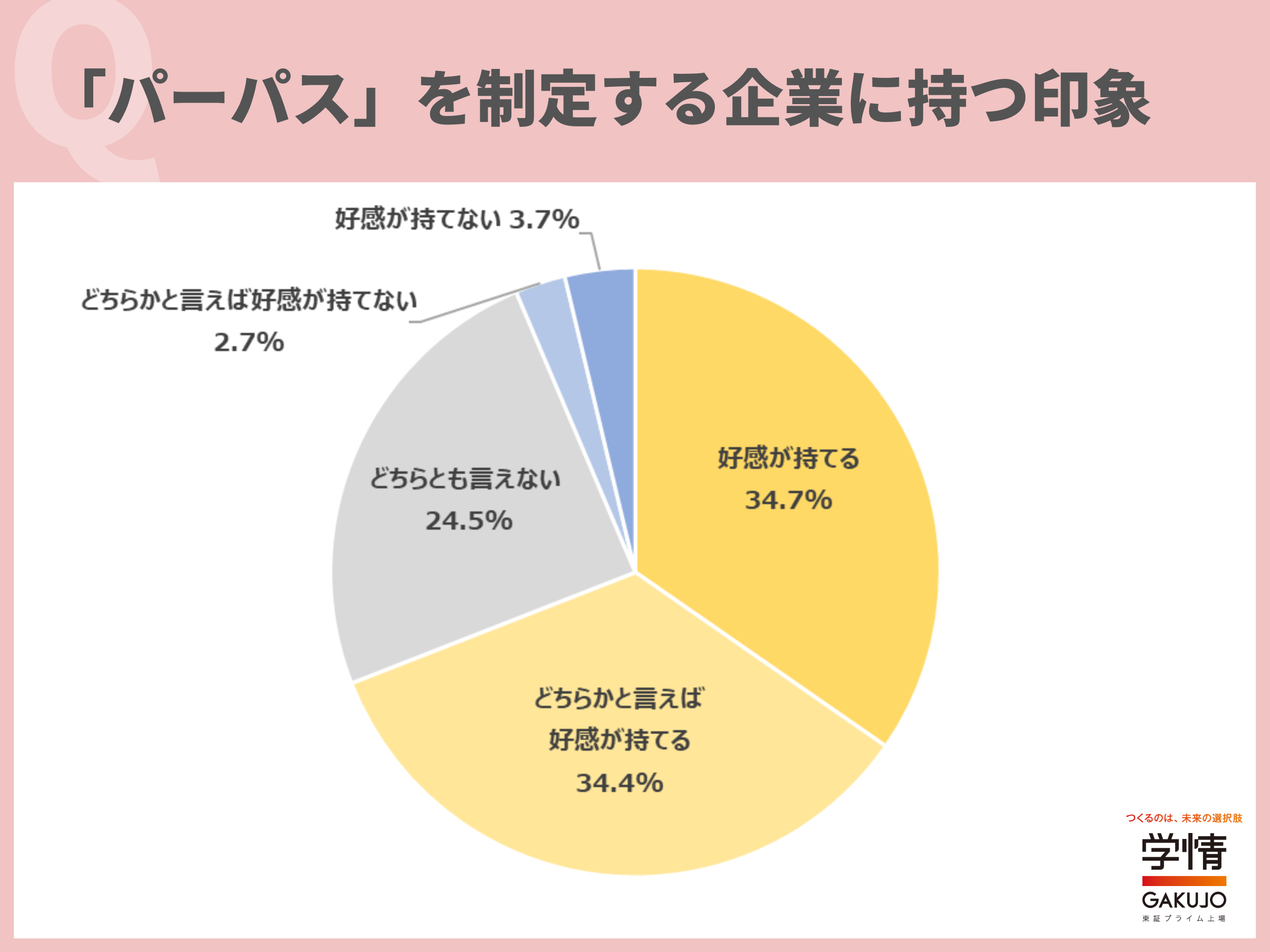 「パーパス」を制定する企業について、「好感が持てる」と回答した学生が34.7%に上りました。「どちらかといえば好感が持てる」34.4%を合わせると、「好感が持てる」とした学生は7割に迫ります。