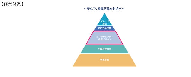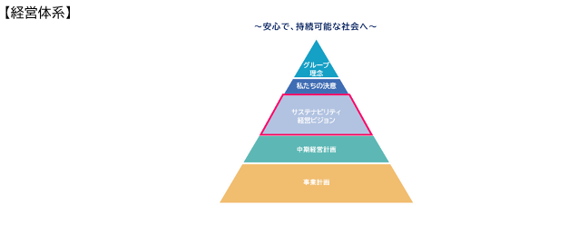SDGs の目標年次である2030 年に向けた当社グループの企業経営の思想及びステークホルダーへの提供価値を示したものとして、 2020年9月に特定した当社のサステナビリティ重要課題(マテリアリティ)をもとに、サステナビリティ経営ビジョンを策定し、経営体系に組み込んでいます。