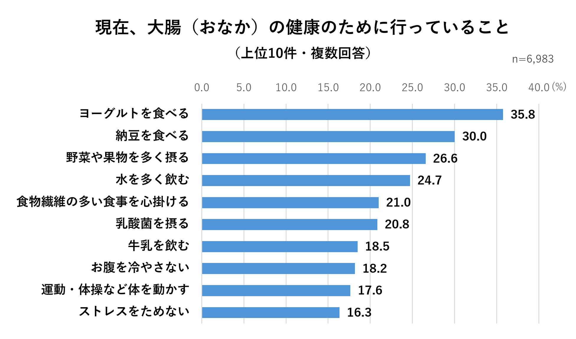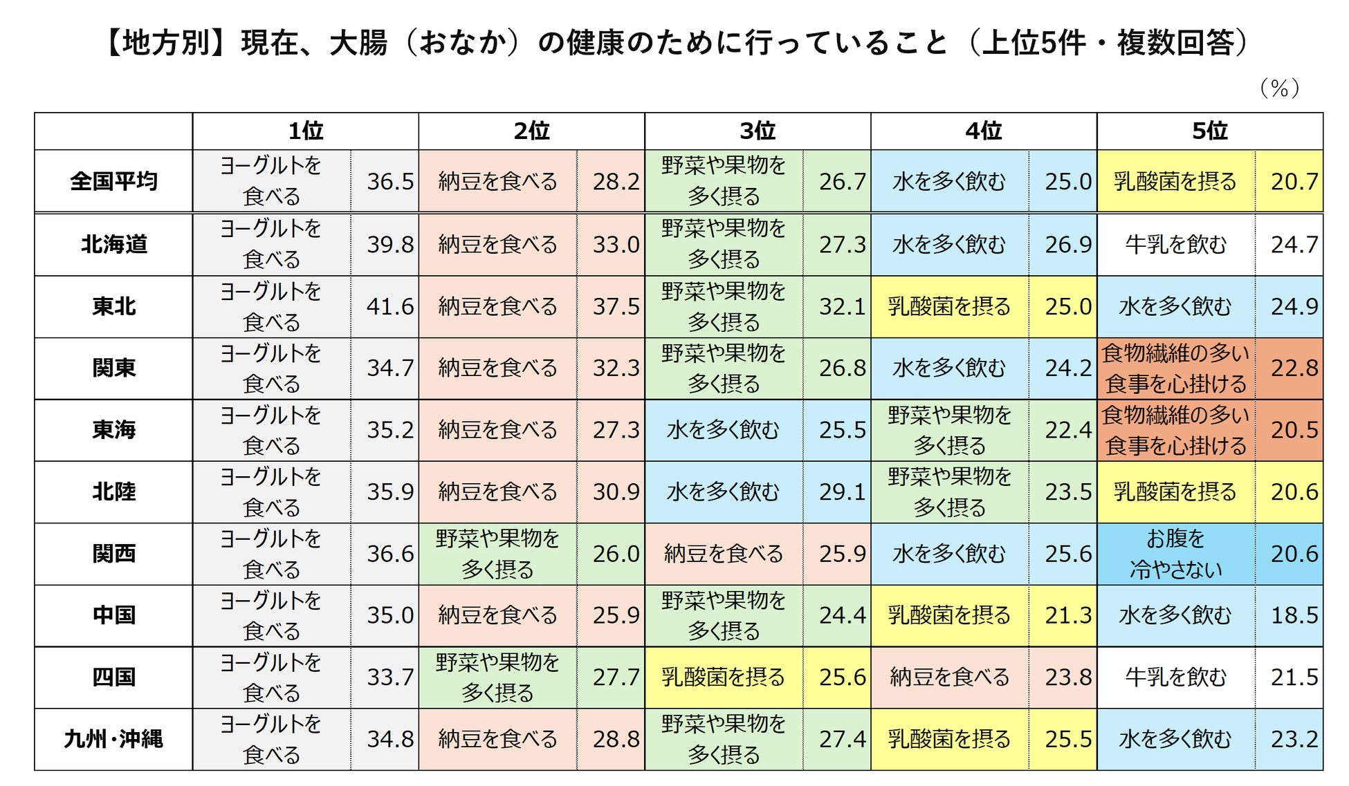 「現在、大腸(おなか)の健康のために行っていること」を食事や運動などの対策から複数選択してもらった結果、全国平均で最も回答率が高かったのは「ヨーグルトを食べる」の35.8%でした。2位以降は、「納豆を食べる」(30.0%)、「野菜や果物を多く摂る」(26.6%)、「水を多く飲む」(24.7%)と、1位に続き、飲食による対策が上位にあがっています。