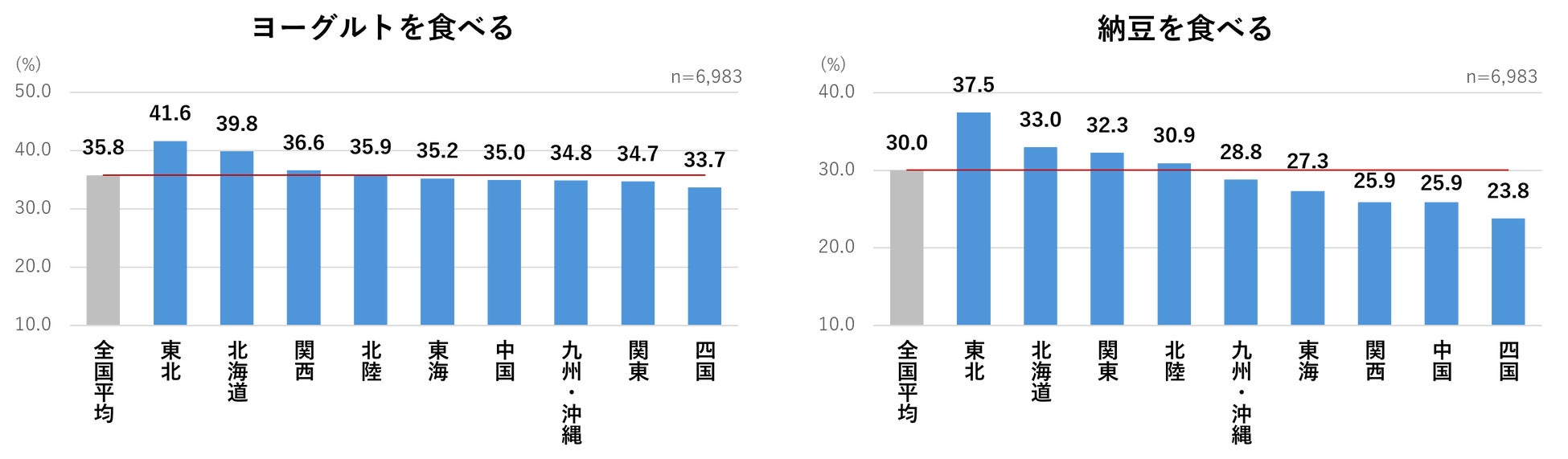 「ヨーグルトを食べる」、「納豆を食べる」、いずれも1位は東北地方、最下位は四国地方。