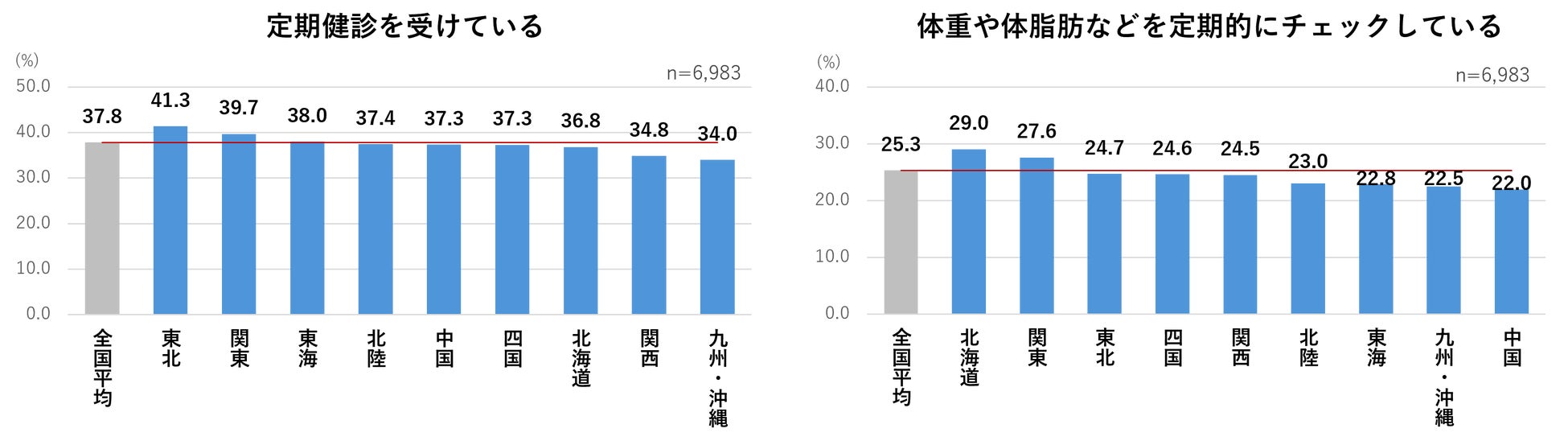 「定期健診を受けている」「体重や体脂肪などを定期的にチェックしている」のいずれも上位なのは東北地方、関東地方、いずれも下位なのは九州・沖縄地方。