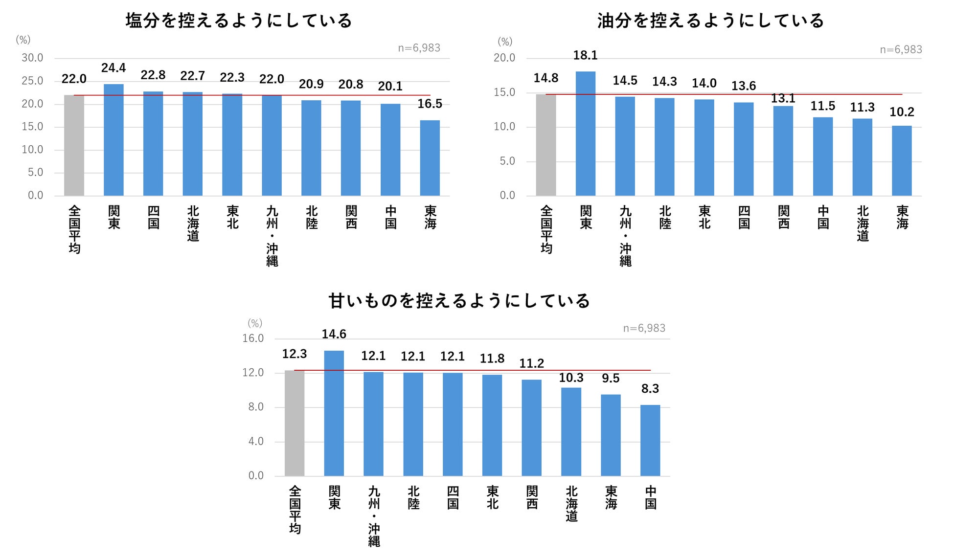 関東地方は、“塩分・油分・甘いものを控えるようにしている”のいずれの項目も1位。