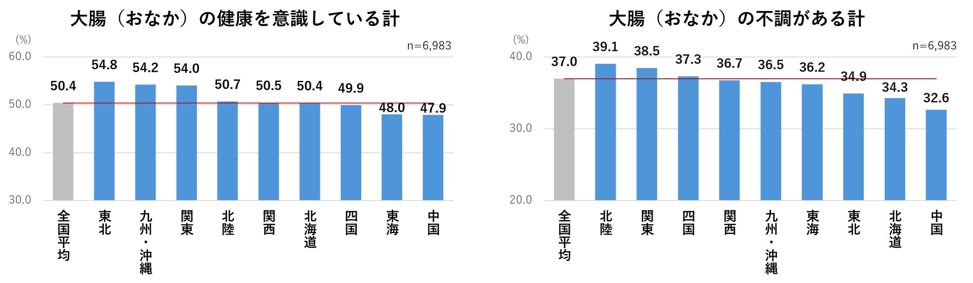 関東地方と北陸地方は、「大腸(おなか)の健康を意識している」人が全国平均より多いにもかかわらず、「大腸(おなか)の不調がある」人が全国平均より多い。