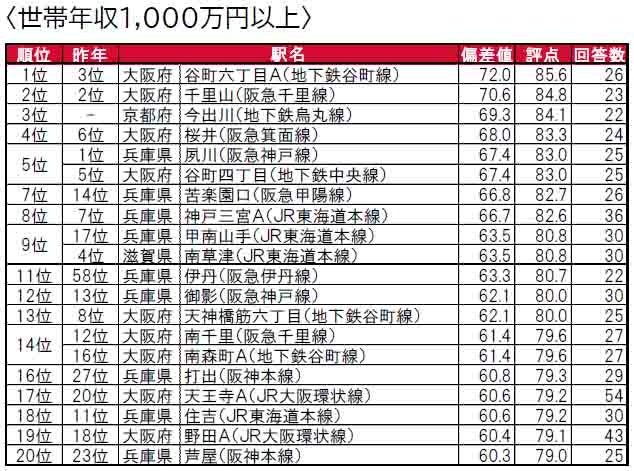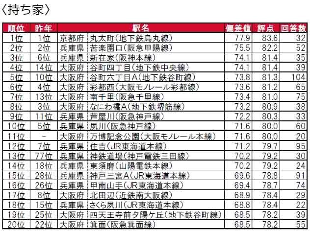 ●駅TOP20には6駅(1位:万博記念公園・6位:京都市役所前・11位:滝井・14位:神鉄道場・16位:桜井・17位:なにわ橋A)がランクインしています。1位~13位までの駅は、偏差値70台の高い評価を得ています。