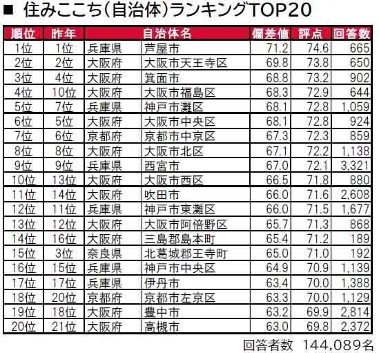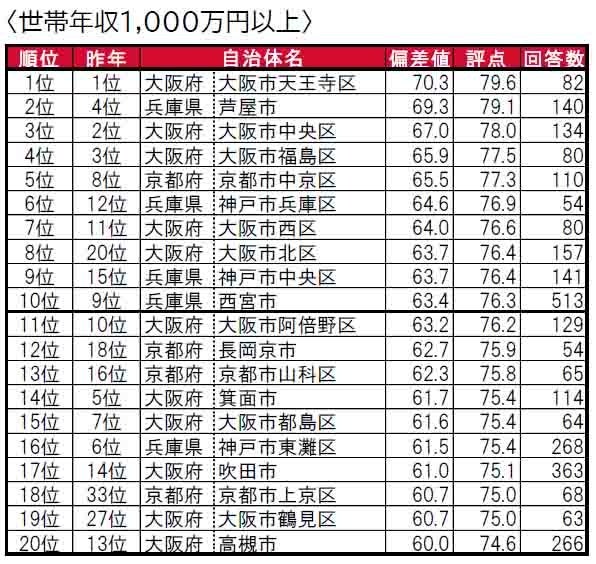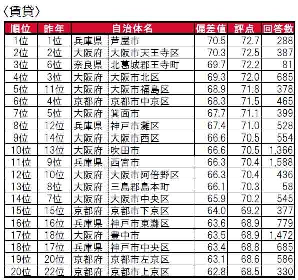 1位は2年連続で兵庫県芦屋市で、唯一偏差値70台の高い評価を得ています。2位も、2年連続で大阪府大阪市天王寺区です。3位は昨年4位だった大阪府箕面市、4位は昨年は10位だった大阪府大阪市福島区です。トップ10内では、10位の大阪府大阪市西区が、昨年13位から順位を上げています。