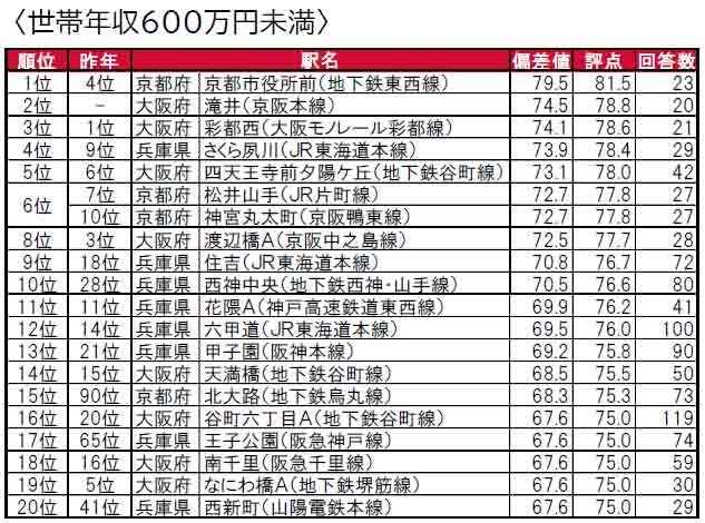 ●世帯年収600万円未満では、京都府京都市中京区に位置する京都市役所前が、昨年4位から順位を上げて1位です。2位は、大阪府守口市に位置する閑静な住宅街の滝井で、昨年は累計回答数が20名未満でランキング集計対象外だった駅です。