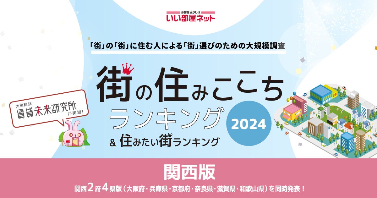 •新聞・雑誌、テレビ・ラジオ等の報道関係者におかれましては、本リリースを掲載・報道または引用する場合には、「いい部屋ネット 街の住みここちランキング2024<関西版>」と出所の表記をお願いします。