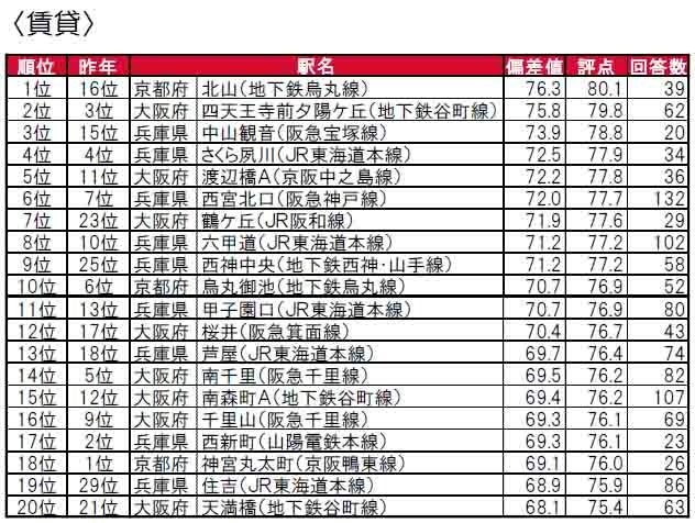 ●賃貸では、京都府京都市北区に位置する北山が、昨年16位から順位を上げて1位です。トップ10内では、3位に兵庫県宝塚市に位置する中山観音(昨年15位)、5位に渡辺橋A(肥後橋・渡辺橋を統合)(昨年11位)、7位に大阪府大阪市阿倍野区に位置する鶴ケ丘(昨年23位)、9位に兵庫県神戸市西区に位置する西神中央(昨年25位)が、それぞれ順位を上げてランクインしています。